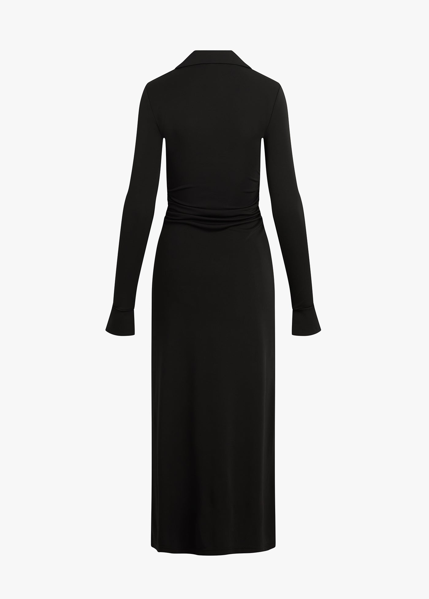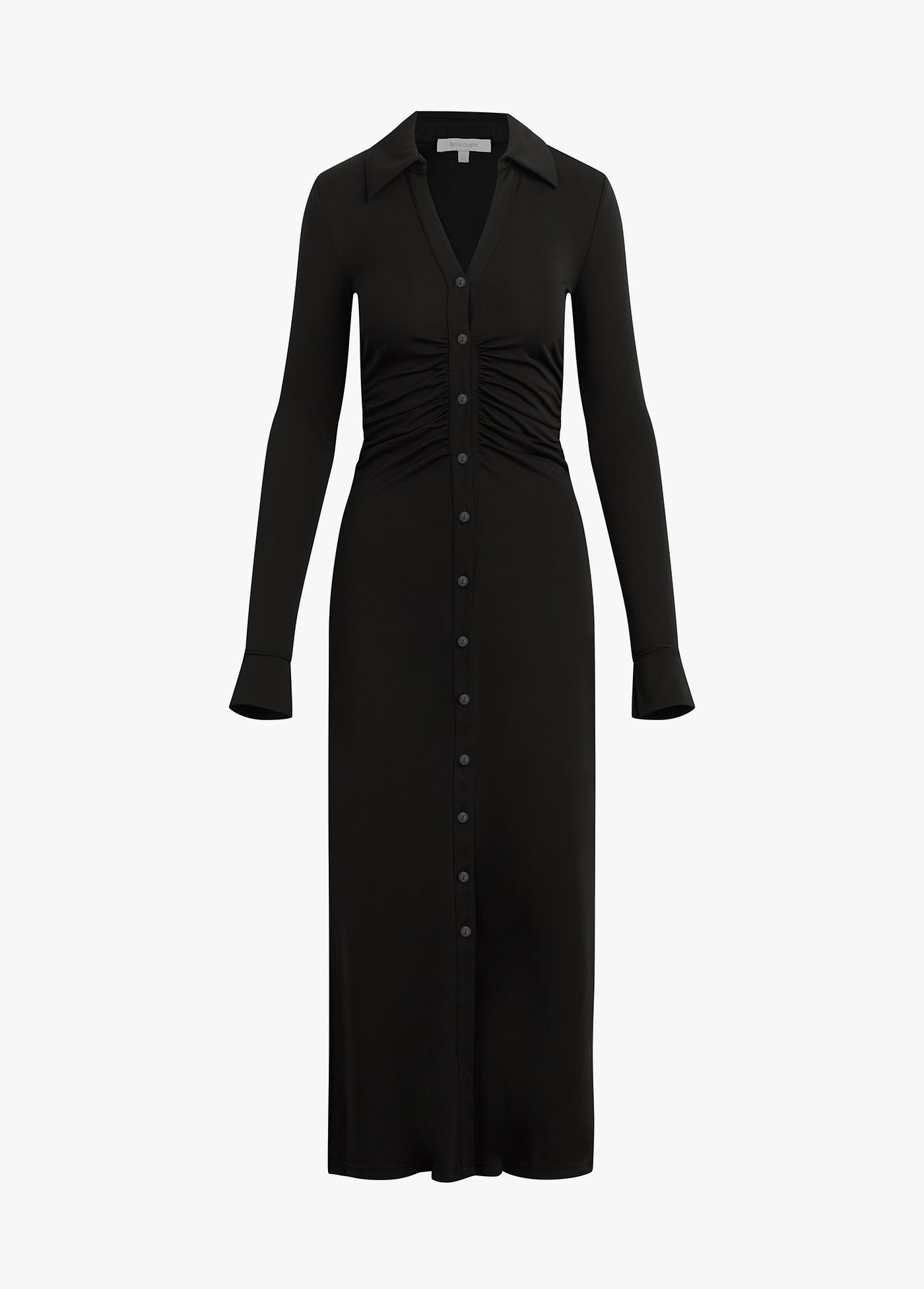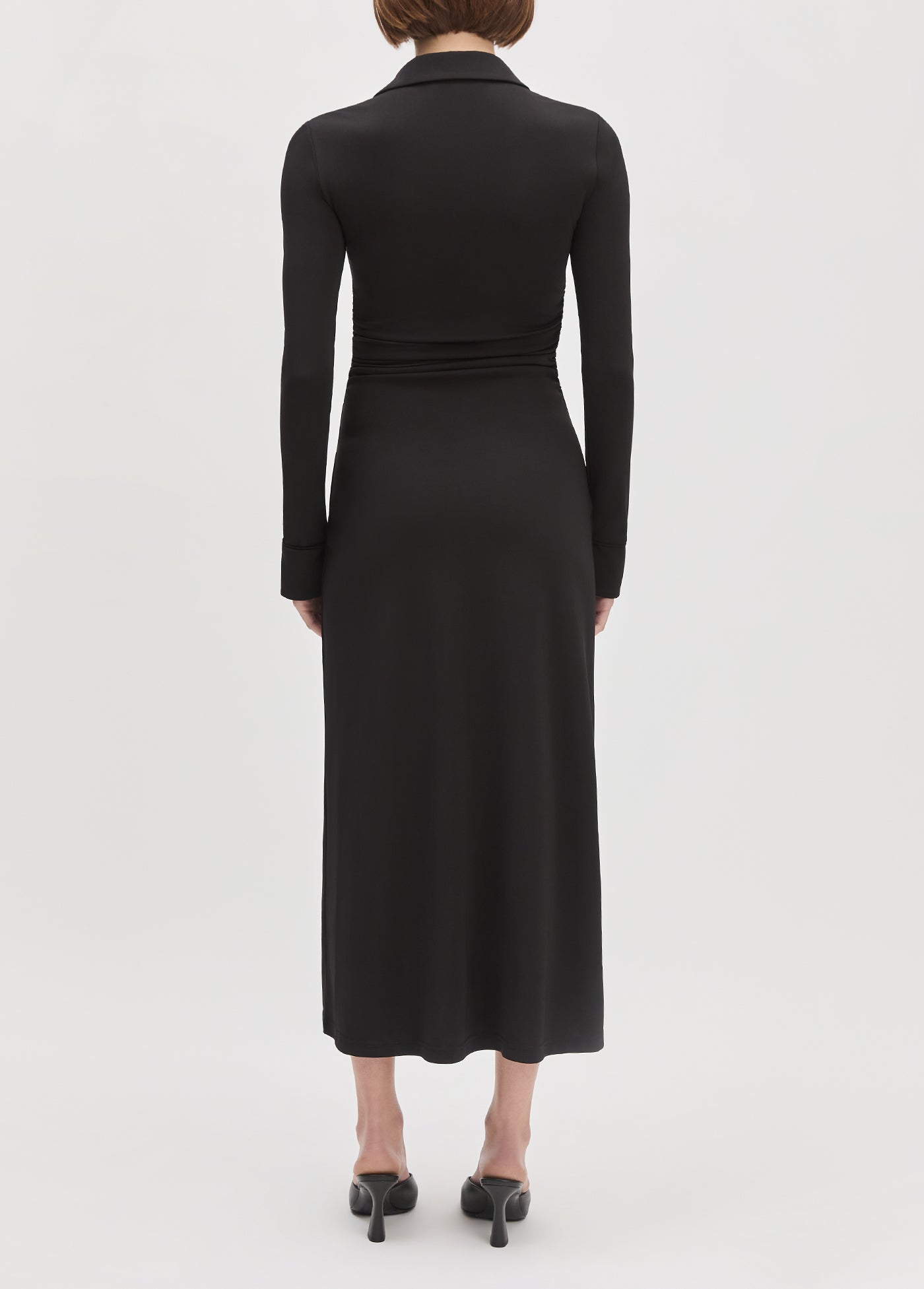 It’s the do-it-all dress. Cut from soft viscose jersey, The Naomi Dress features a collared button front, long sleeves, a fitted bodice, and a gentle flare at the skirt that measures 52". Our favorite detail is the ruching that creates a super flattering fit.