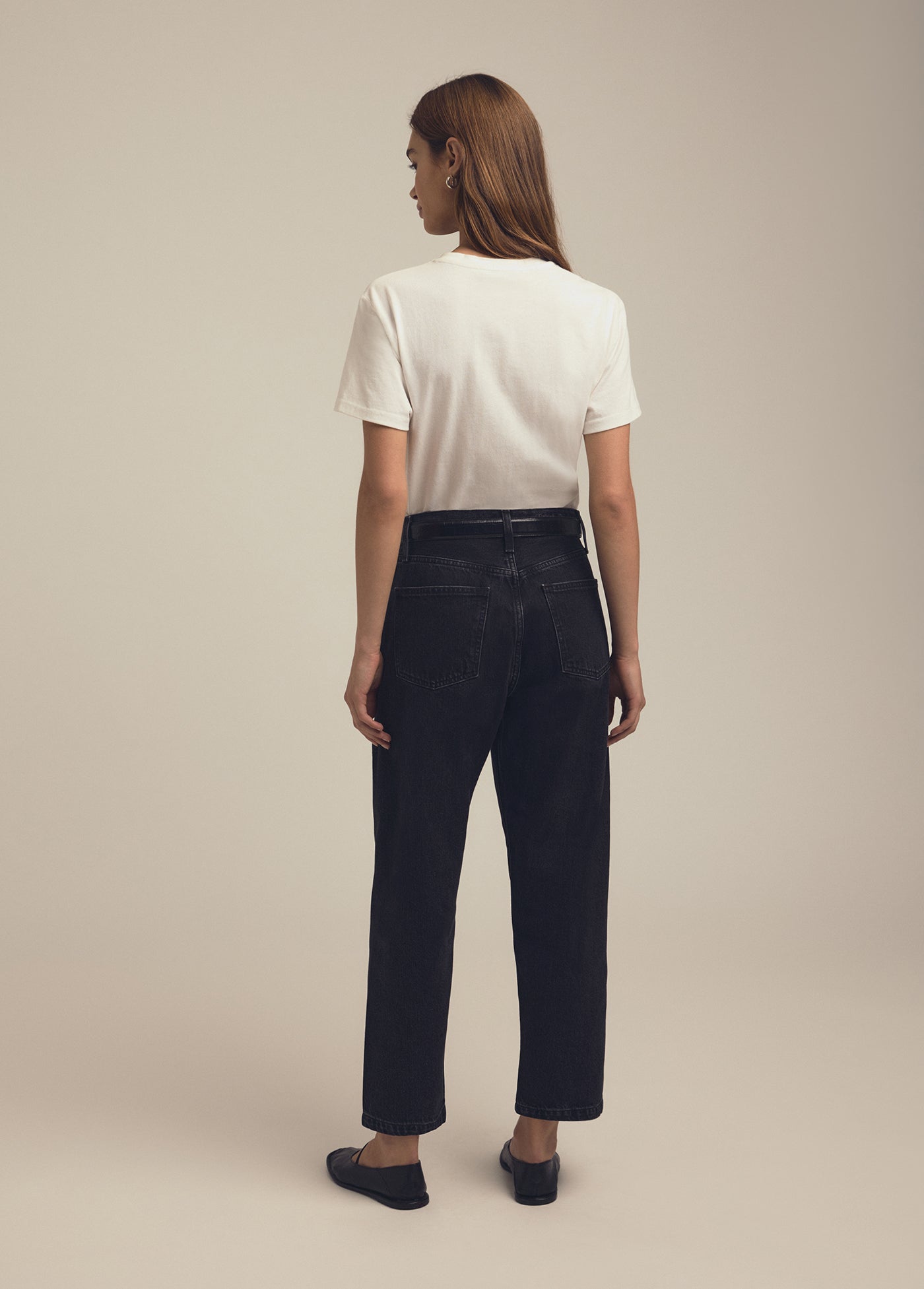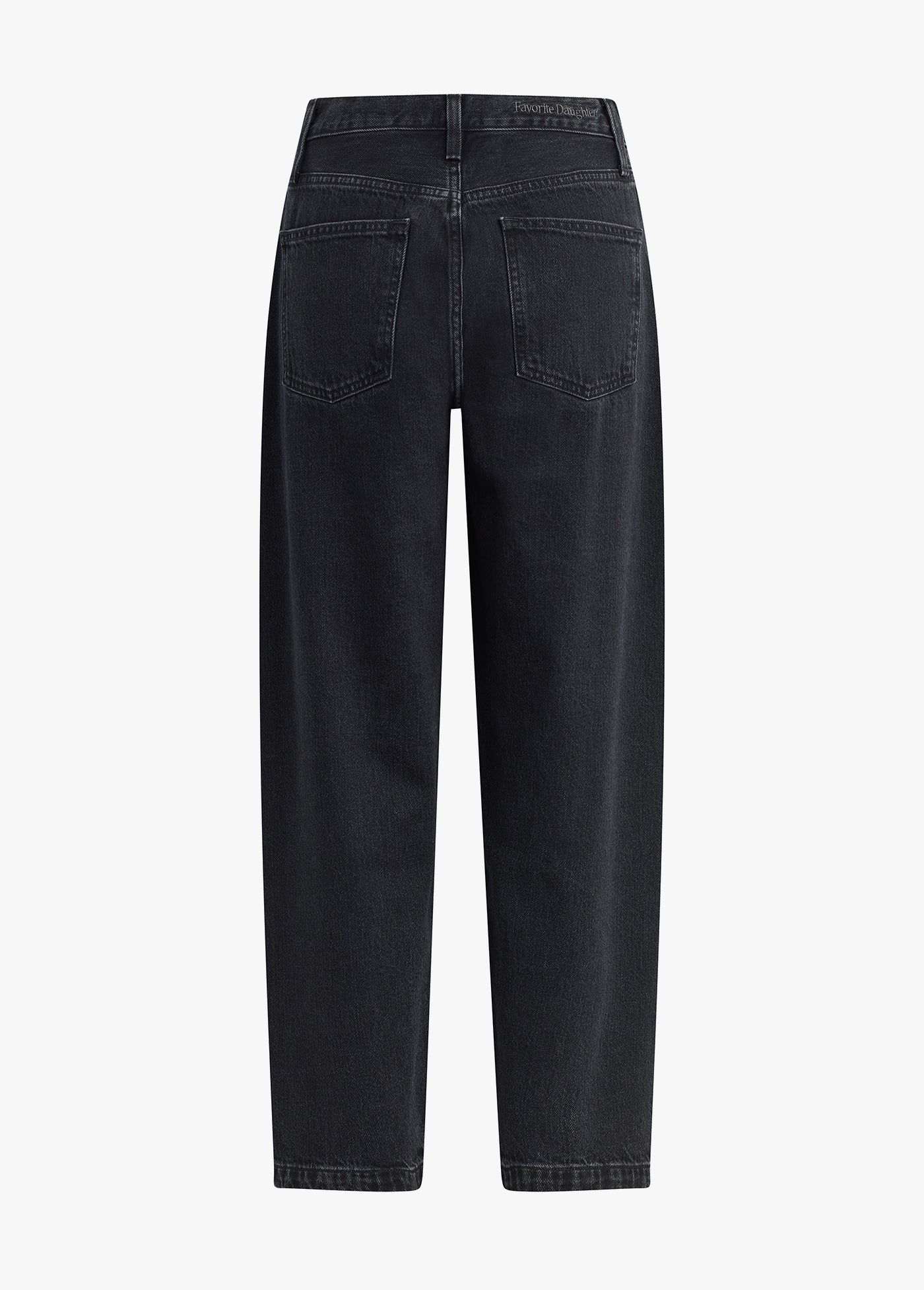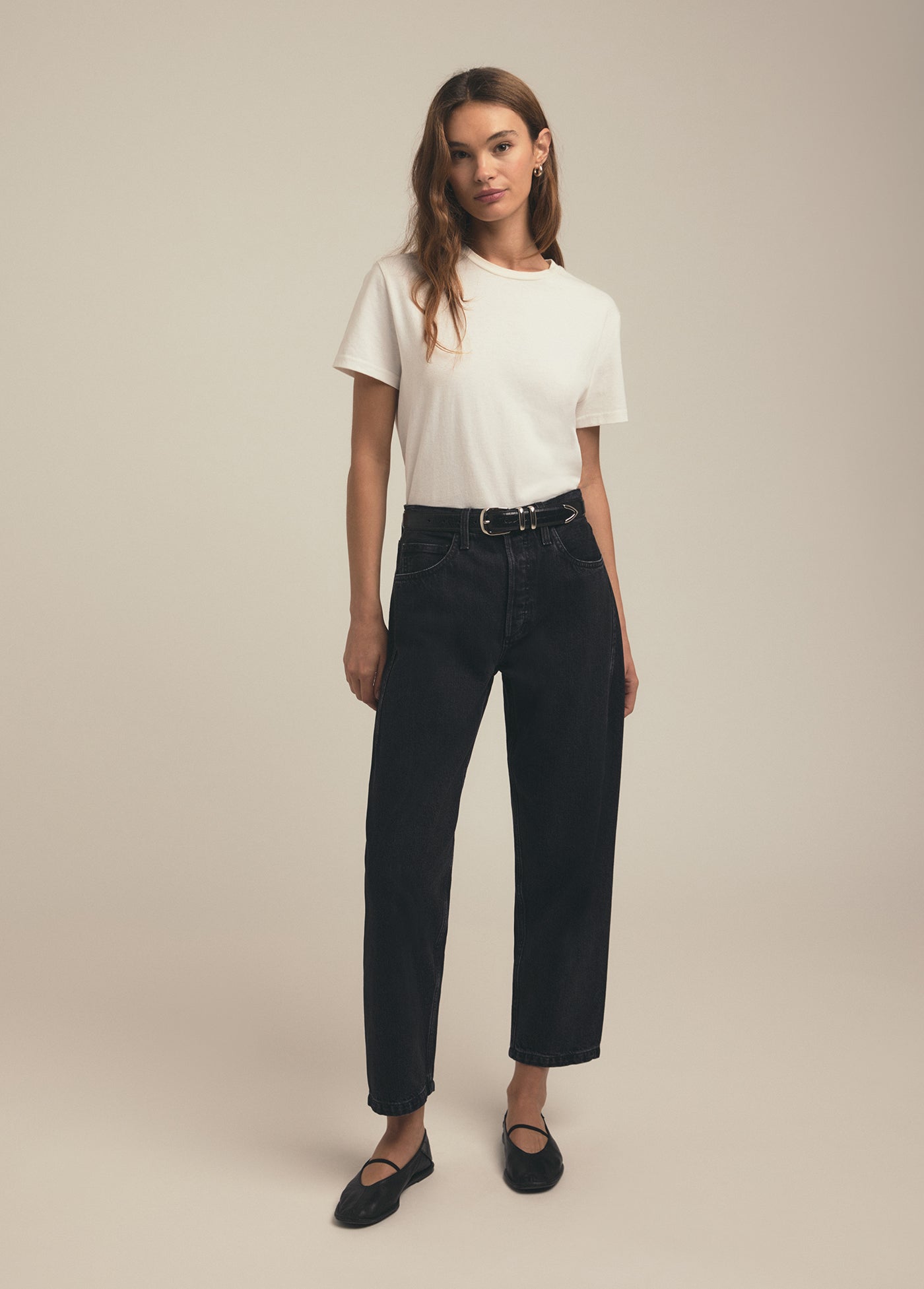 Easy does it with the Nikki. The mid-rise fit is easy at the hips and thighs with a slight barrel, tapered hem. The pair is a faded black shade to show the highs and lows of the wash. Unlike most traditional five-pocket pairs, The Nikki has no side seam but we've added a slightly asymmetrical dart towards the front. (And Favorite Daughter embroidery at the back waistband, of course.)