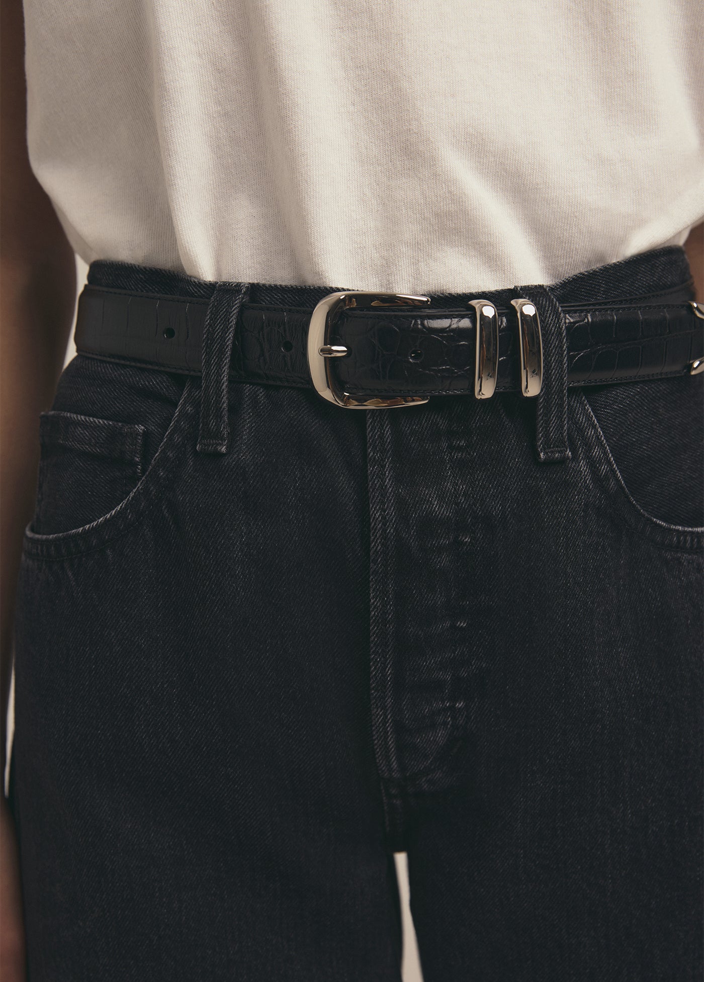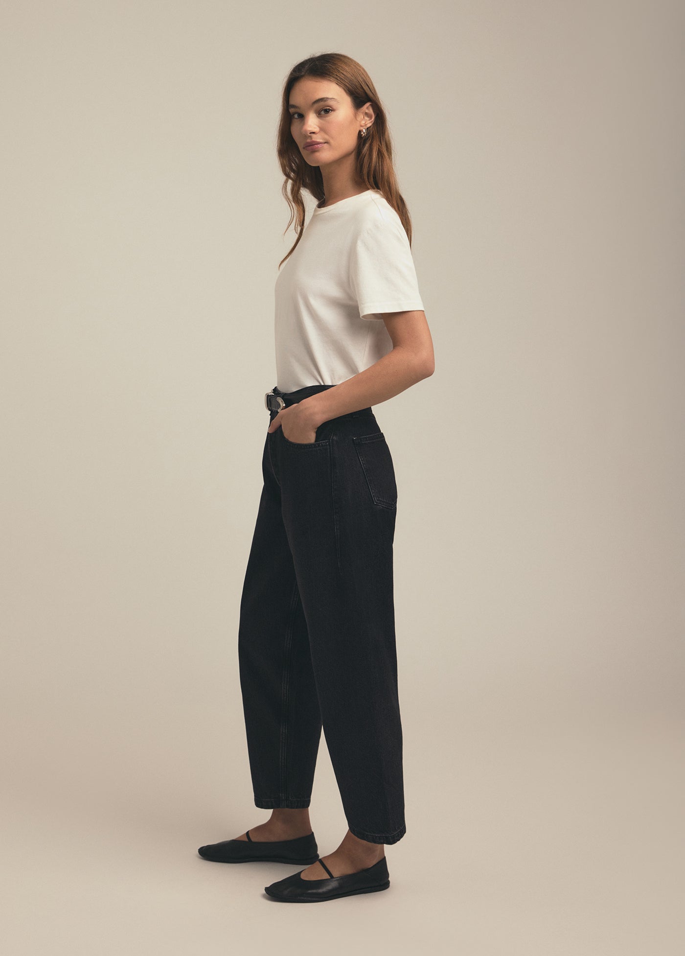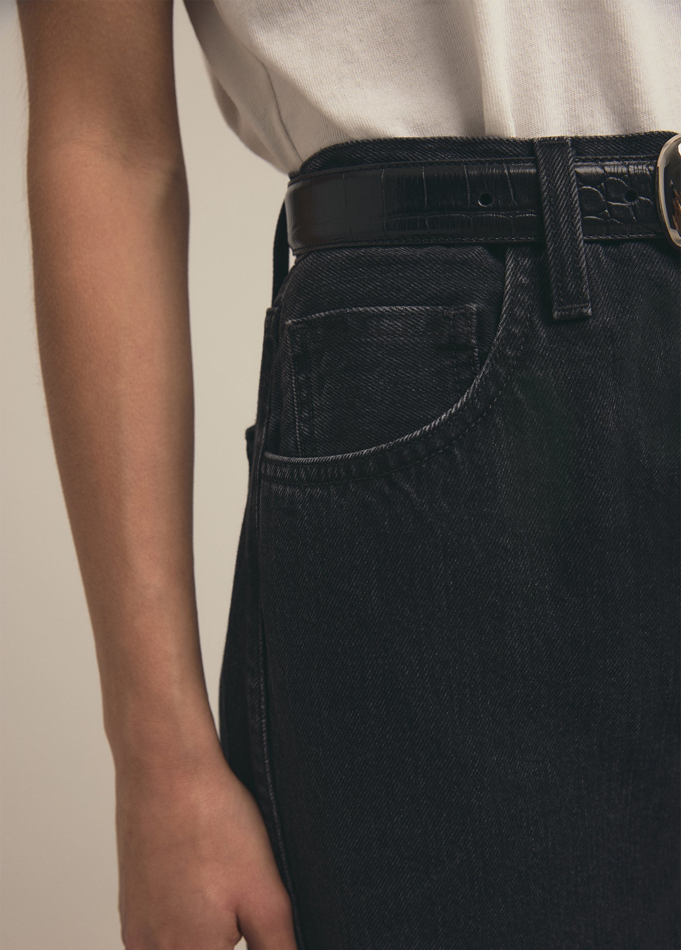 Easy does it with the Nikki. The mid-rise fit is easy at the hips and thighs with a slight barrel, tapered hem. The pair is a faded black shade to show the highs and lows of the wash. Unlike most traditional five-pocket pairs, The Nikki has no side seam but we've added a slightly asymmetrical dart towards the front. (And Favorite Daughter embroidery at the back waistband, of course.)