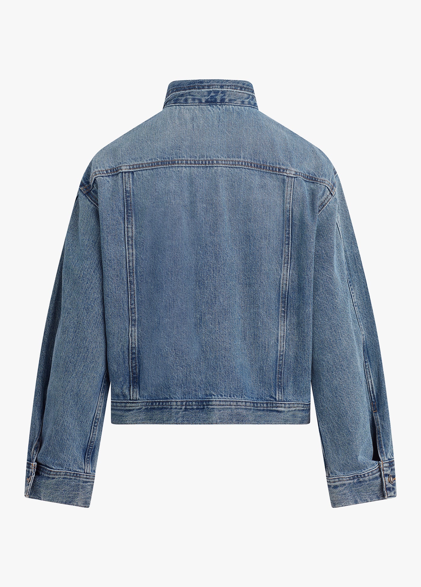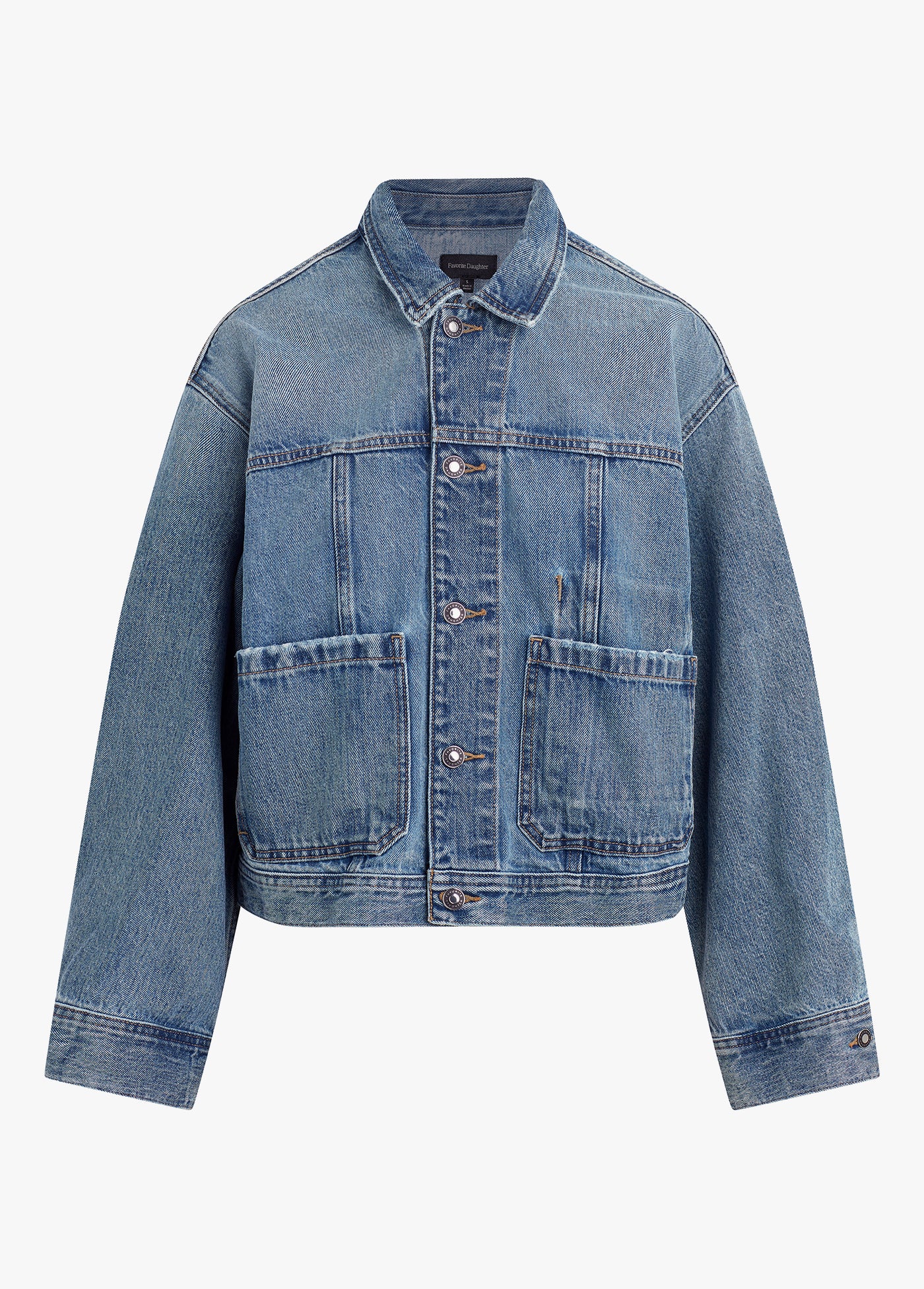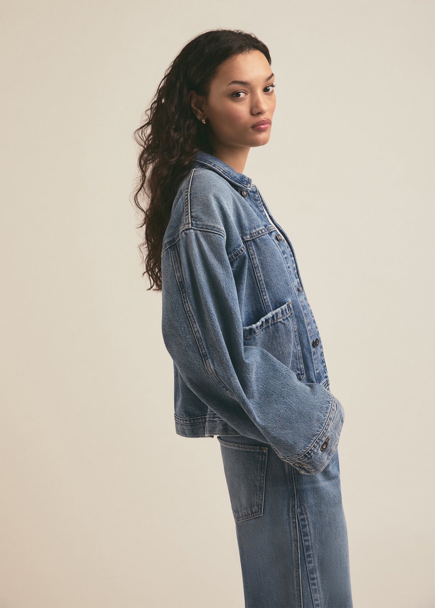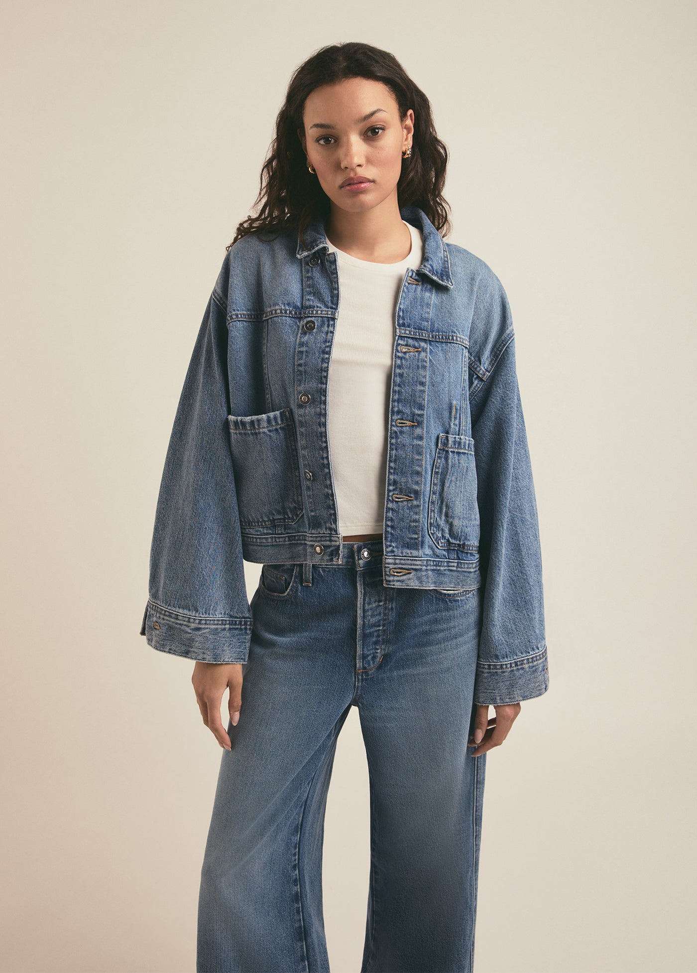 FINAL SALE - NO RETURN / EXCHANGEWith a boxy fit, patch pockets and dropped shoulders, The Oliver Jacket is timelessly on-trend. Cut from a vintage medium-blue denim, it has a wide hem and bell sleeves with button cuffs for adjustable styling. It's a slightly oversized favorite for fall (well, year round, actually) and looks especially great when paired with the baggy Oliver jeans for a head-to-toe denim ensemble.