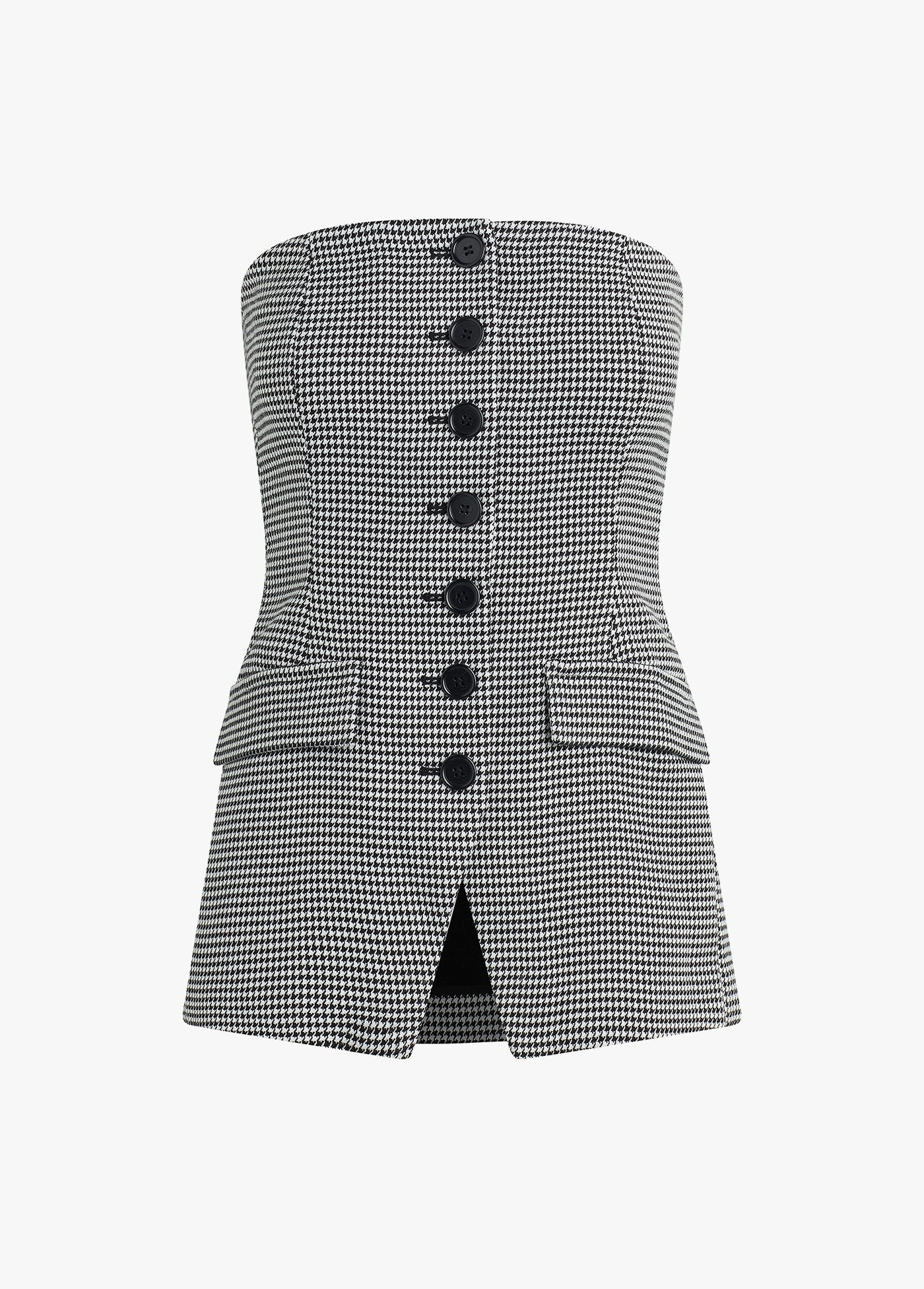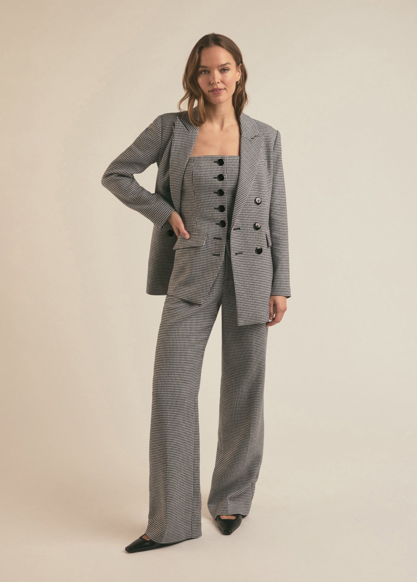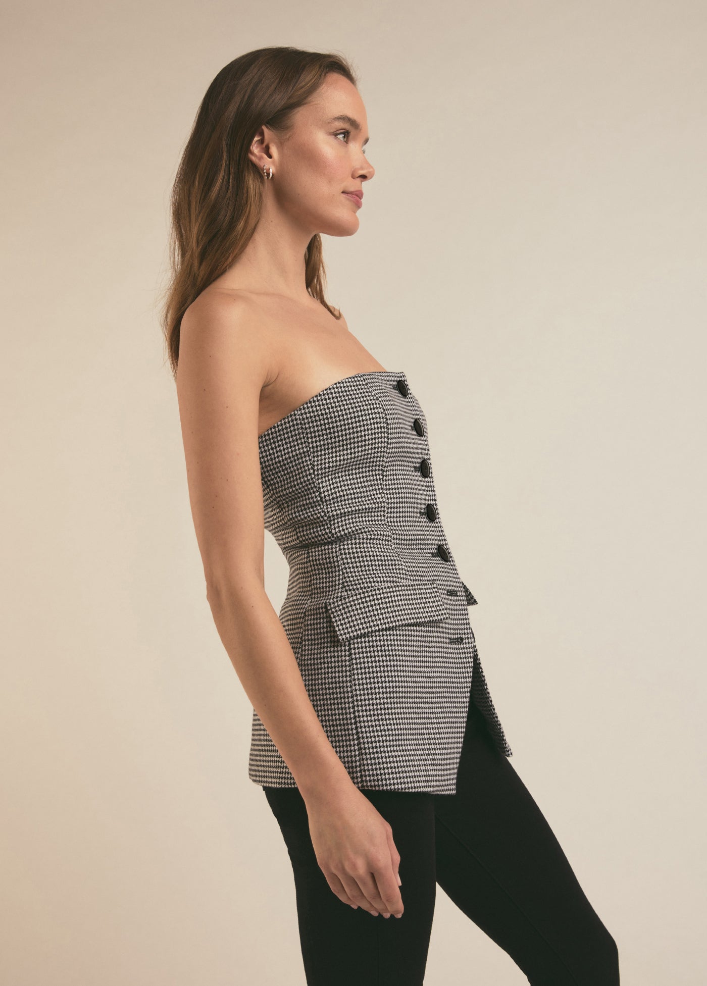 FINAL SALE - NO RETURN / EXCHANGEBorrowed from the boys, this bustier in a structured, jacquard-viscose blend Houndstooth has classic menswear styling--structured shape, front buttons and front flap pockets. The Phoebe Bustier is a classic and looks especially sharp paired with your favorite denim or styled as a set with The Low Favorite Pant.