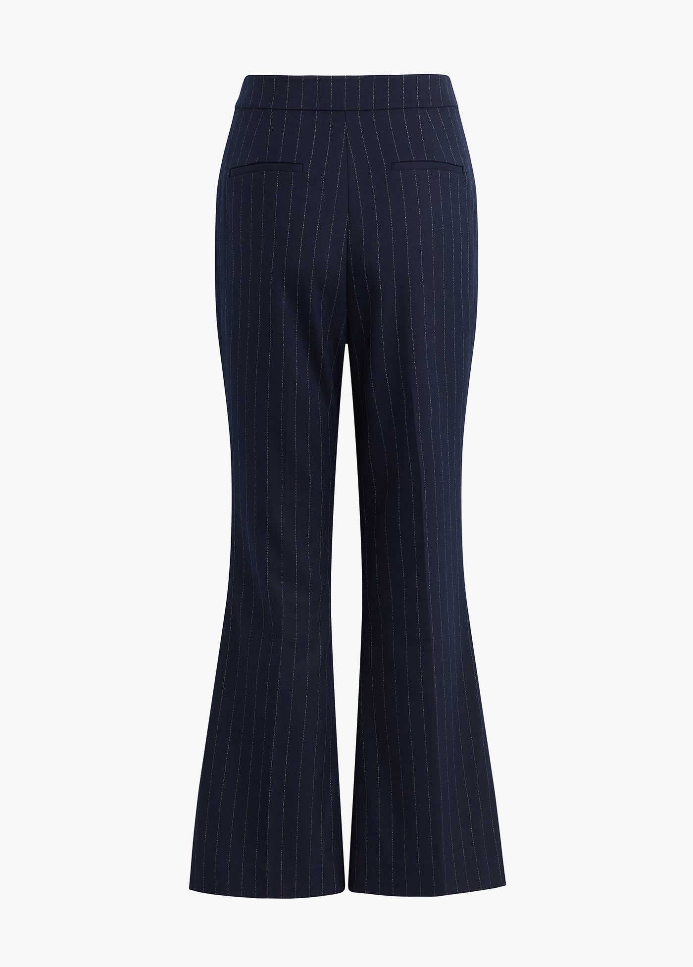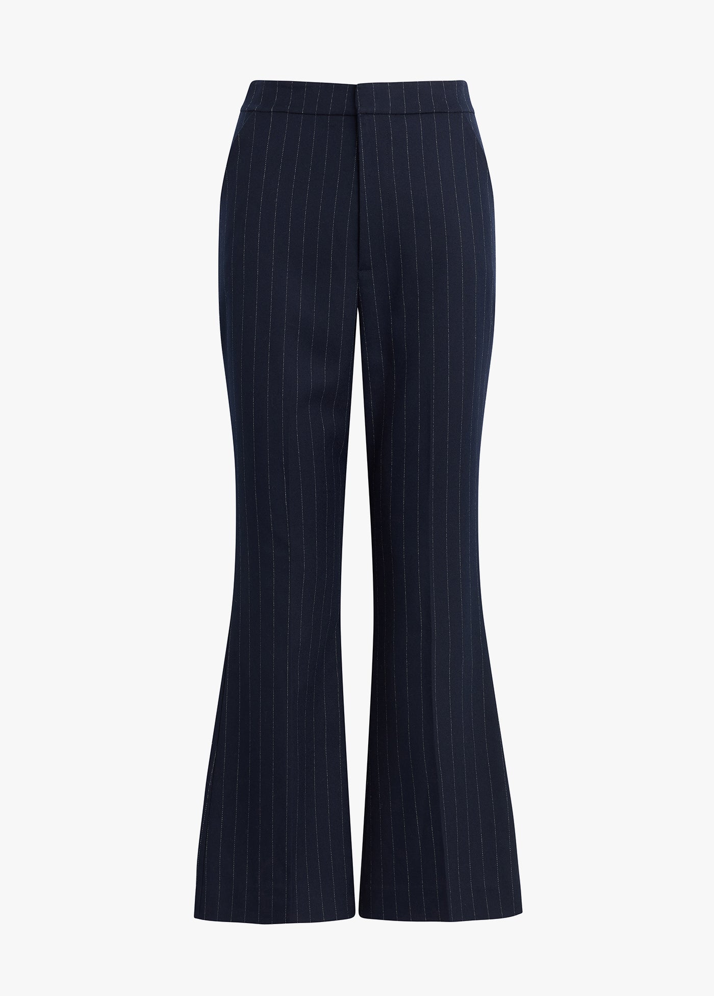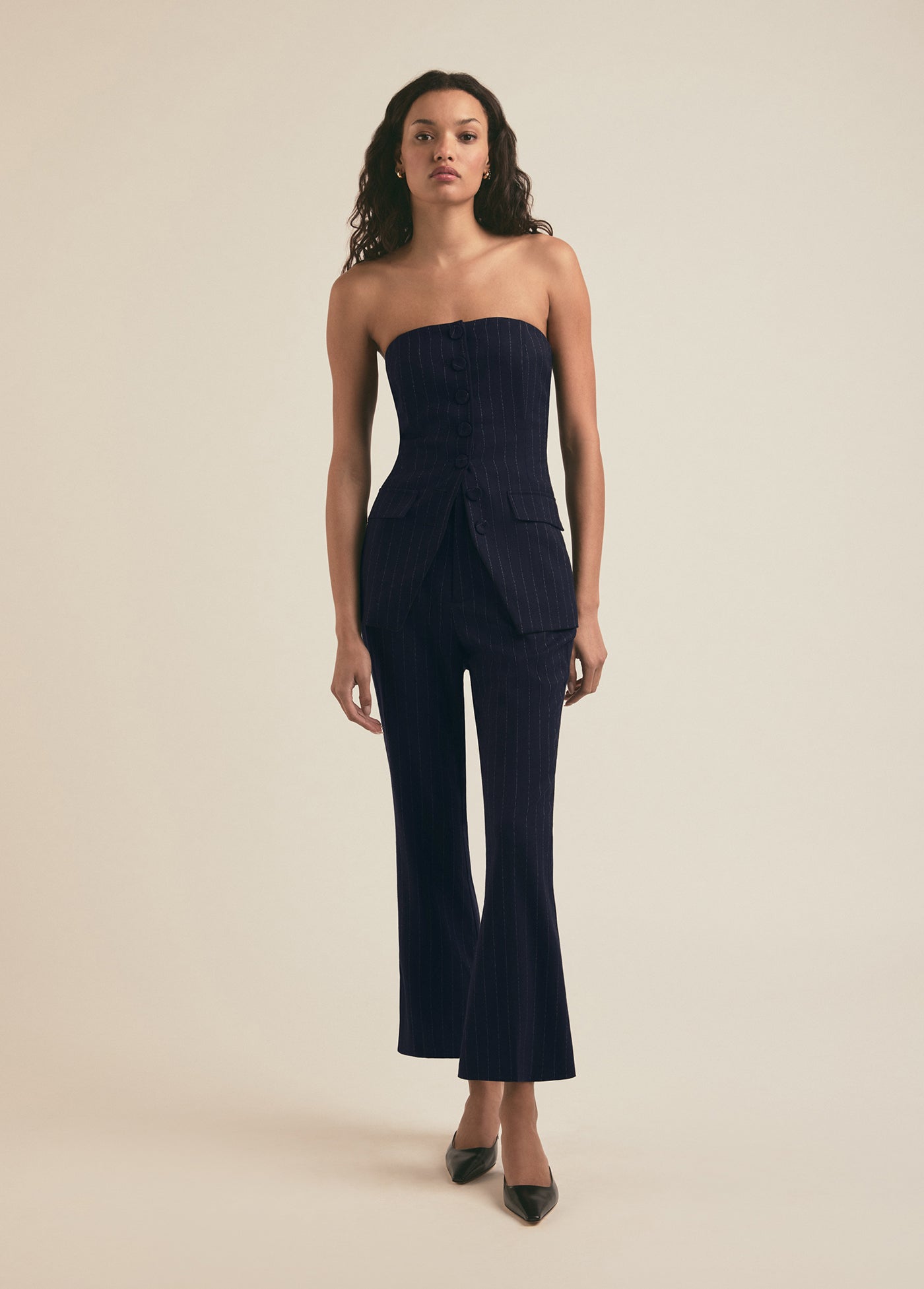 Add some flare with our Phoebe Pant. Made from a classic navy pinstripe with stretch for added comfort, the pant is cut for a tailored fit and finished with back welt pockets and flared hem. Pair with the matching Phoebe Bustier for a favorite look.
