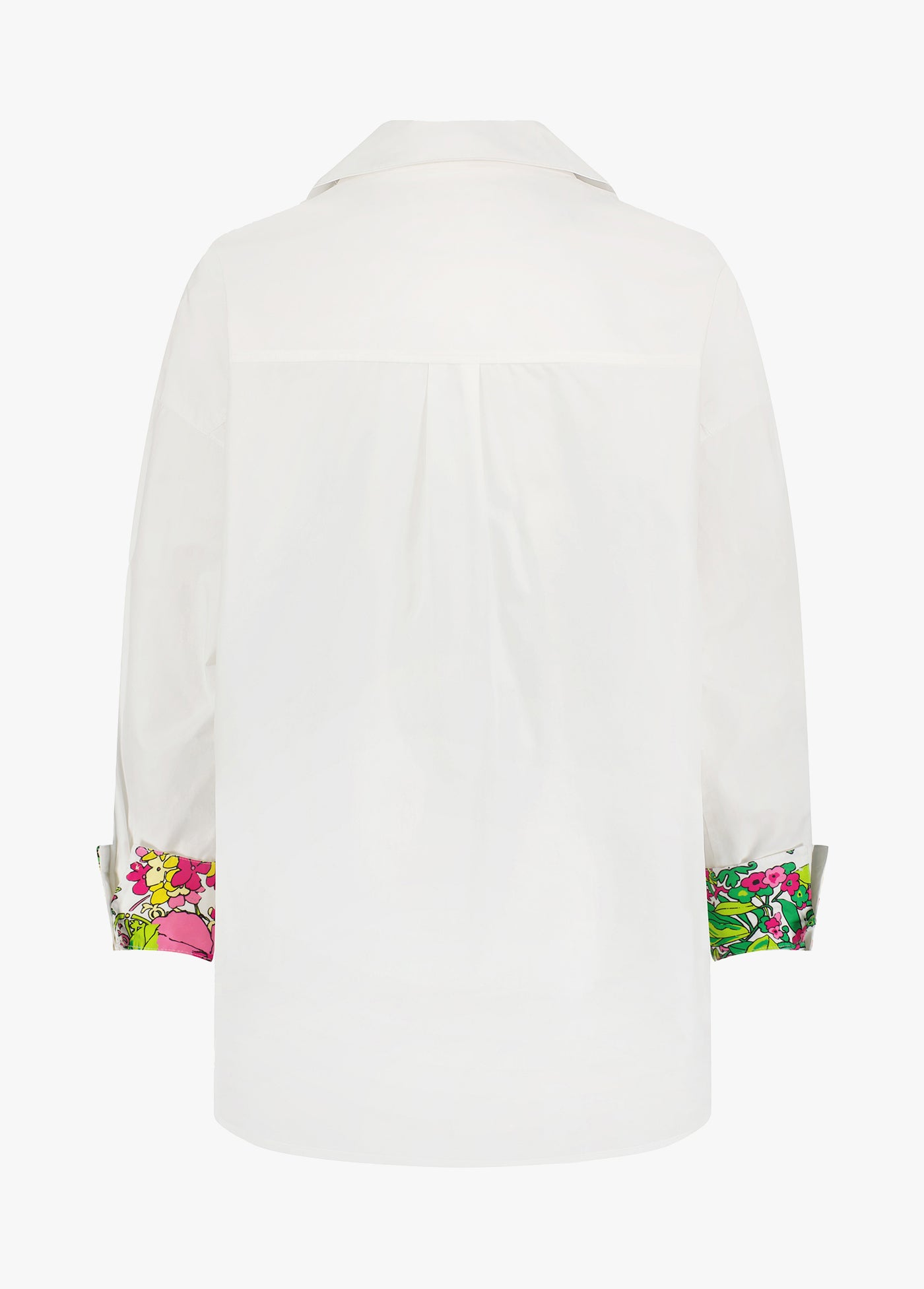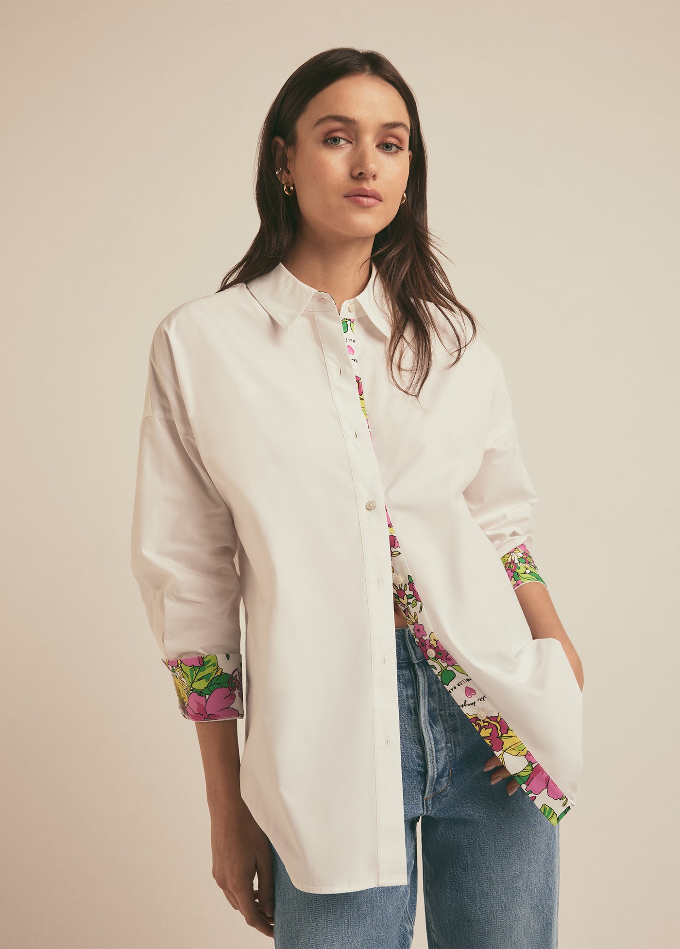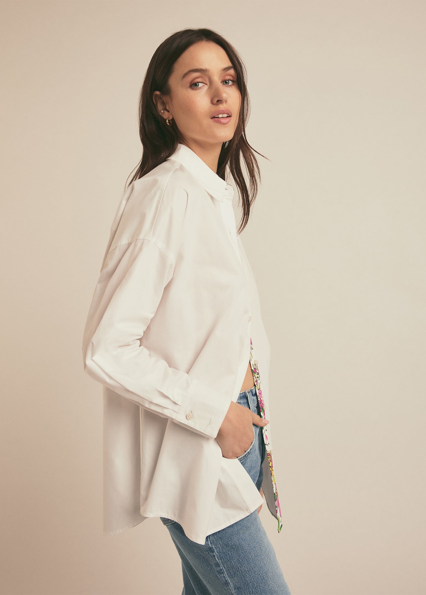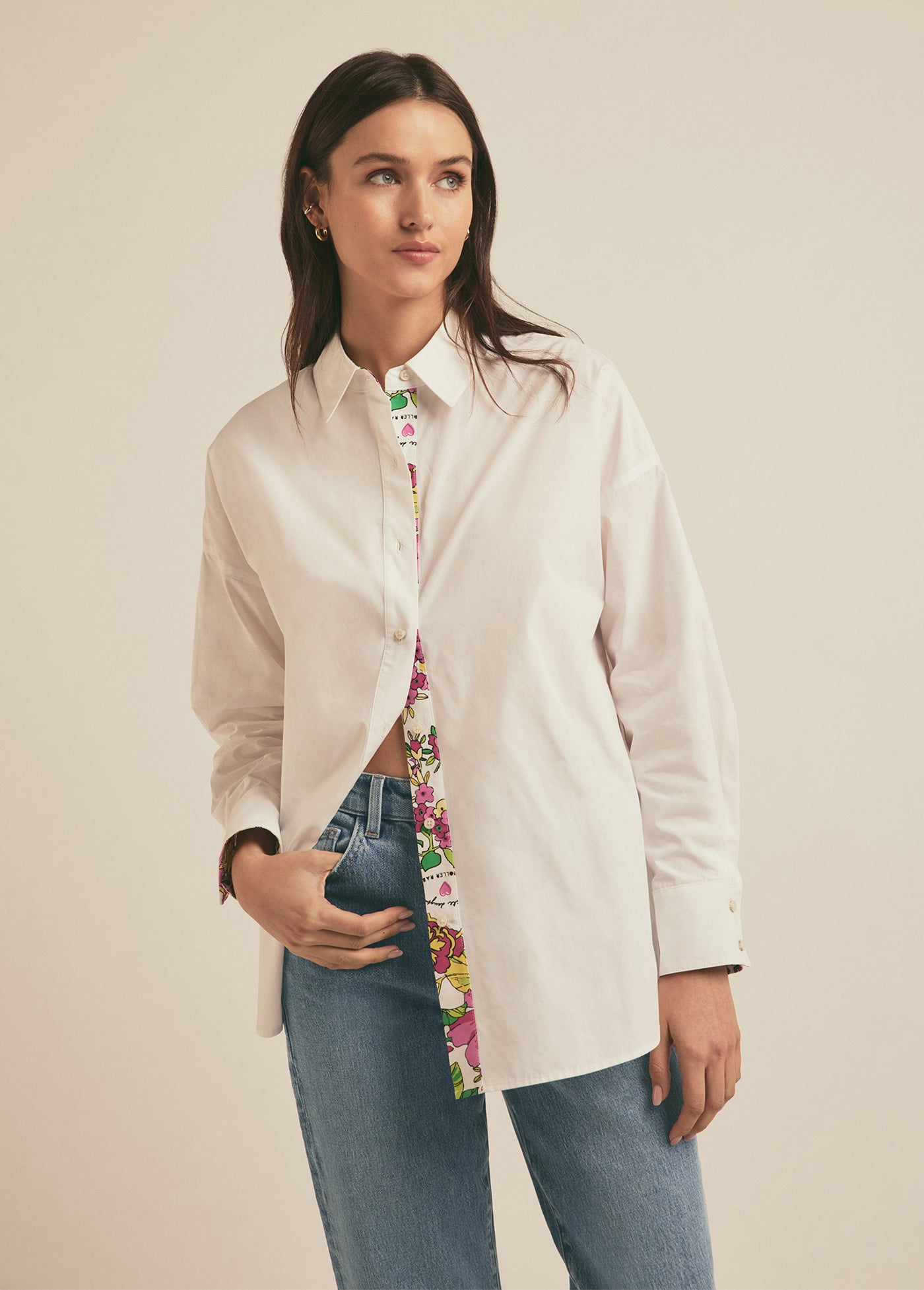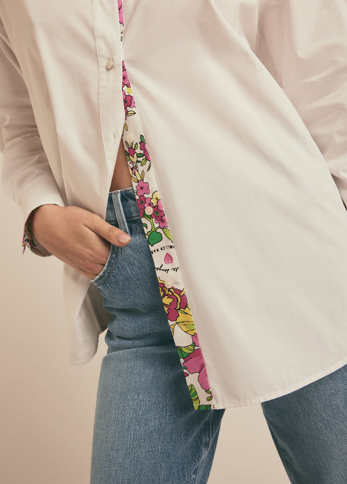 With a relaxed fit, pointed collar and back box pleat, the Roller Rabbit Ex-Boyfriend Shirt has the same oversized look as our best-selling orignal, and we've added signature embroidery to the front placket and a hint of contrasting floral print inside. Our favorite way to wear this cotton poplin button-up is, actually, any way–tied, tucked, half-tucked, and unbuttoned.
