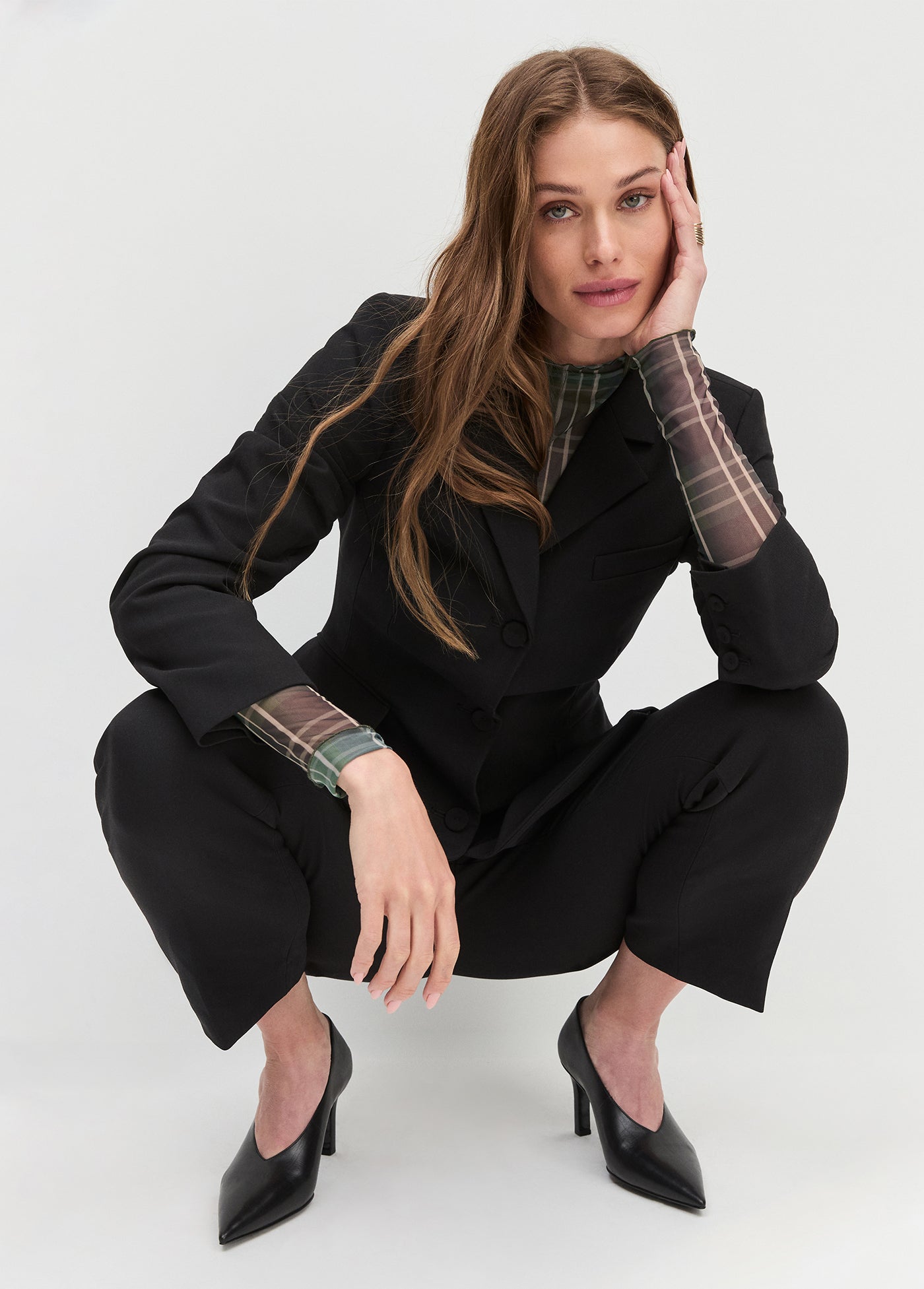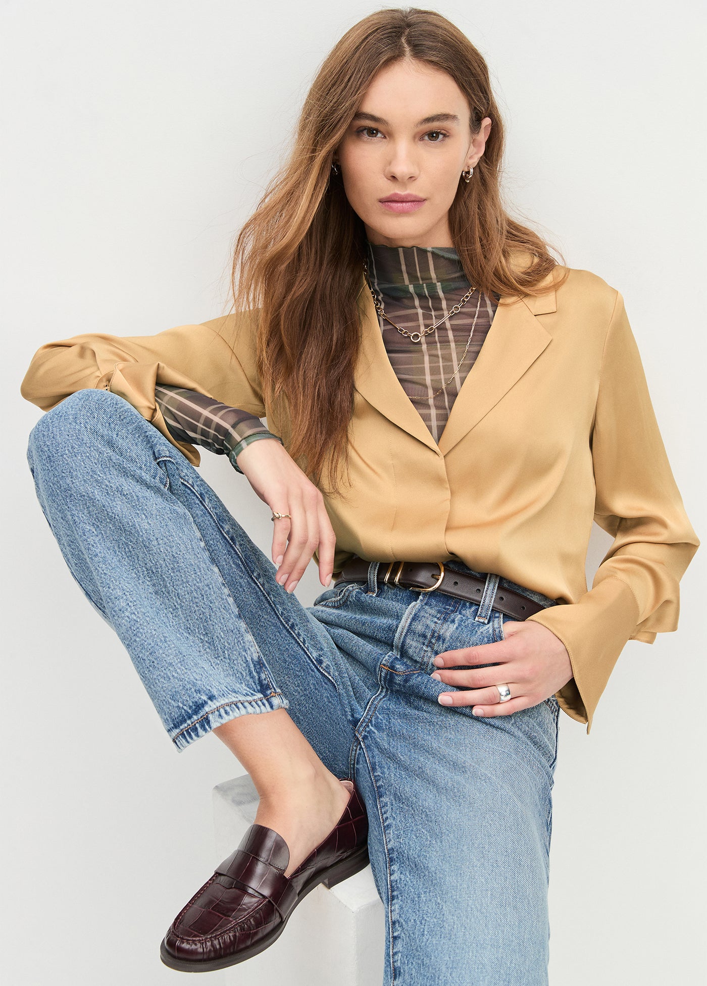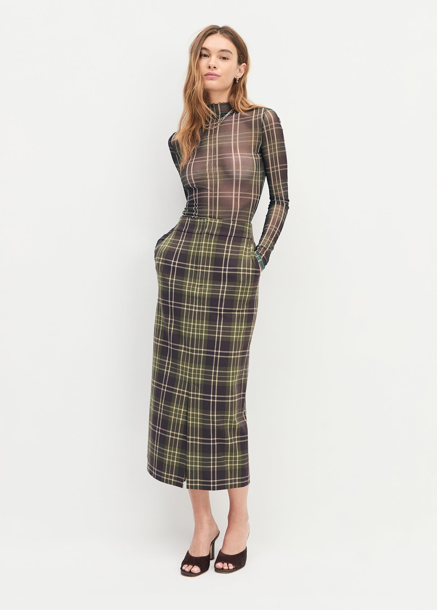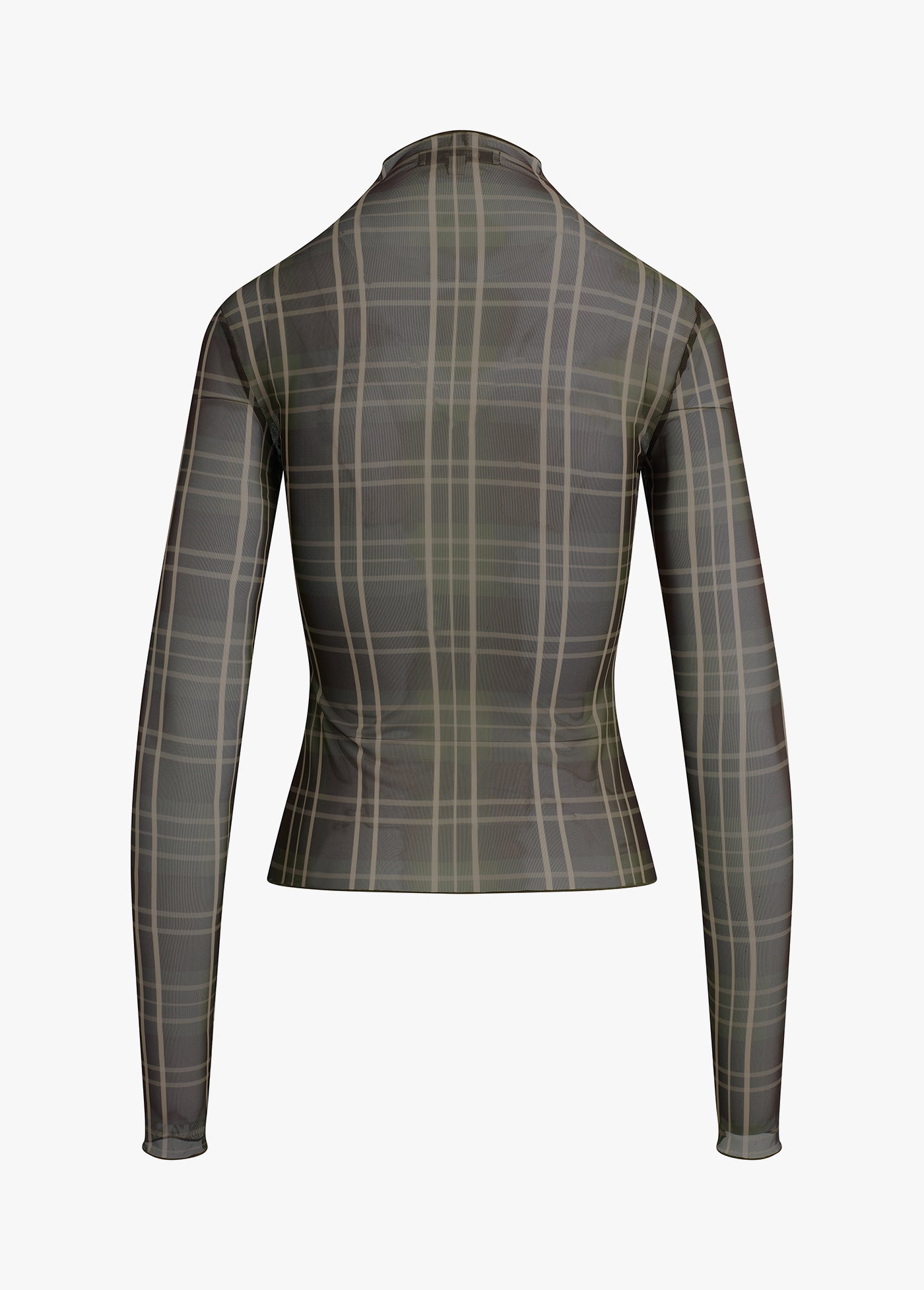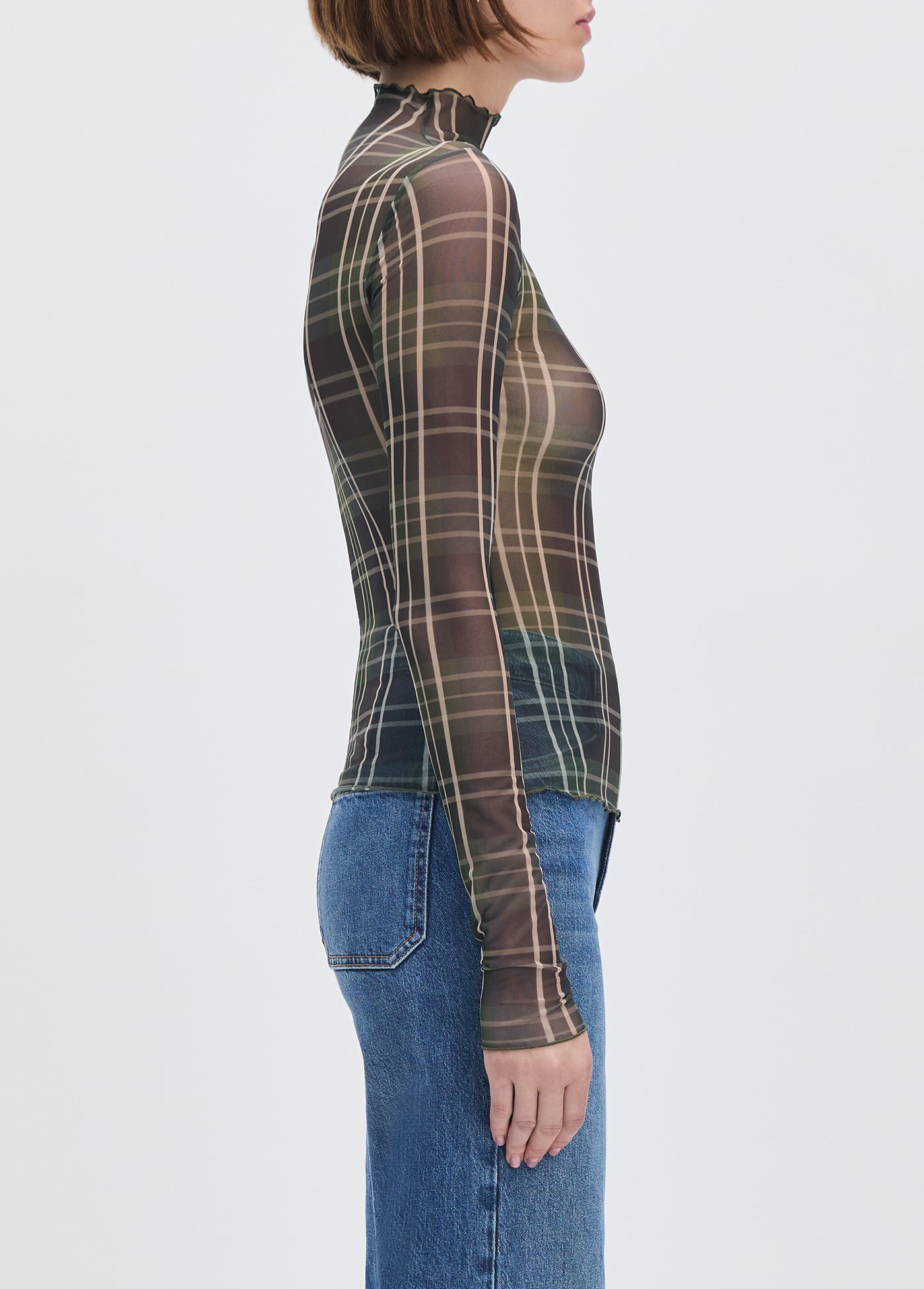 Sheer fantasy, for real. With a body-skimming fit, The Sheer Fantasy Top features a mesh mockneck and sheer sleeves. Pretty and plaid all at once.