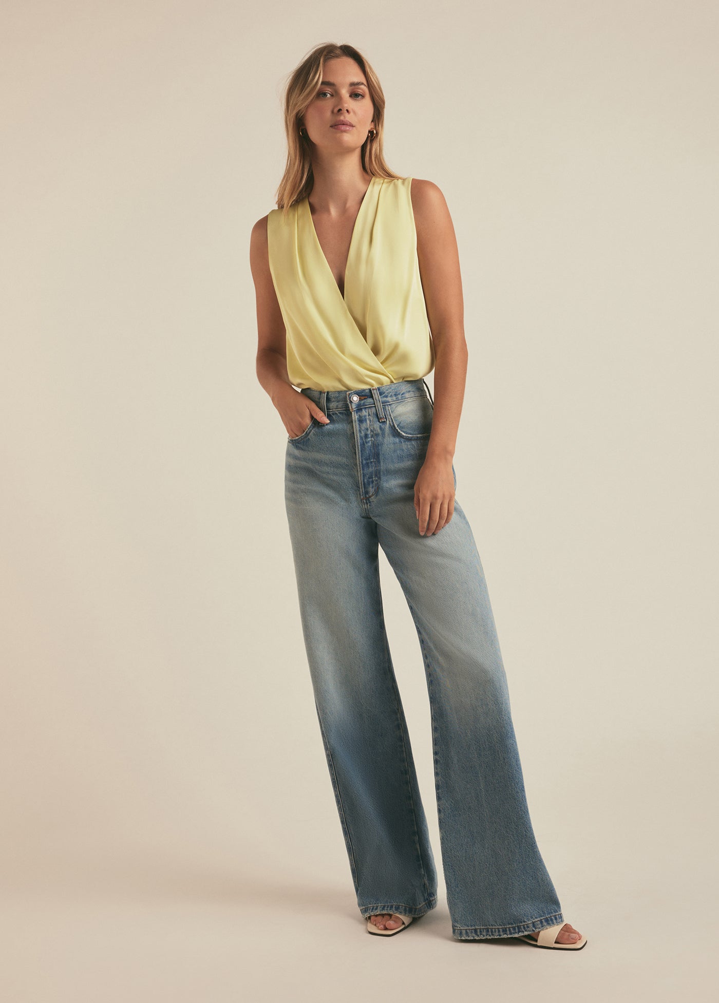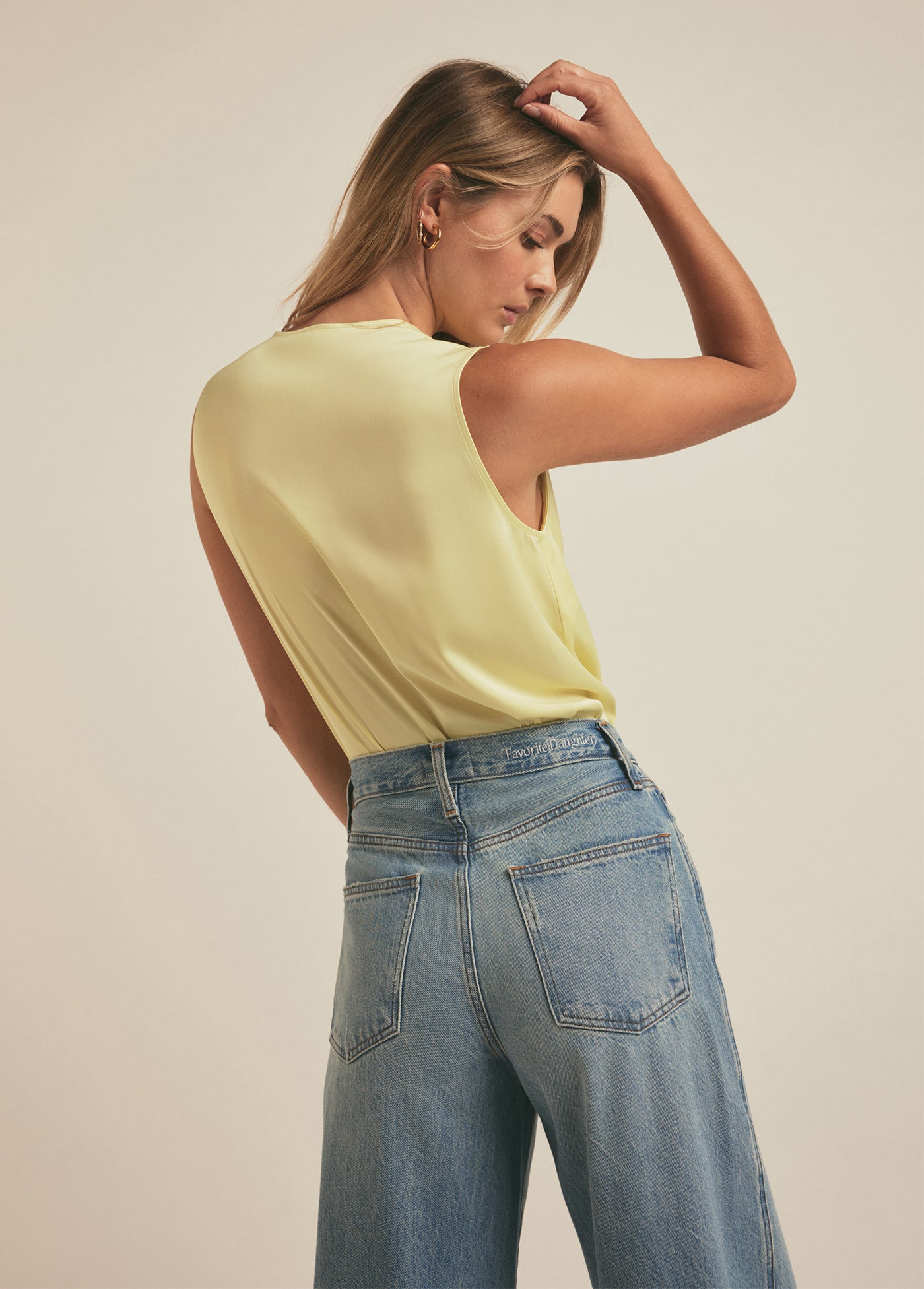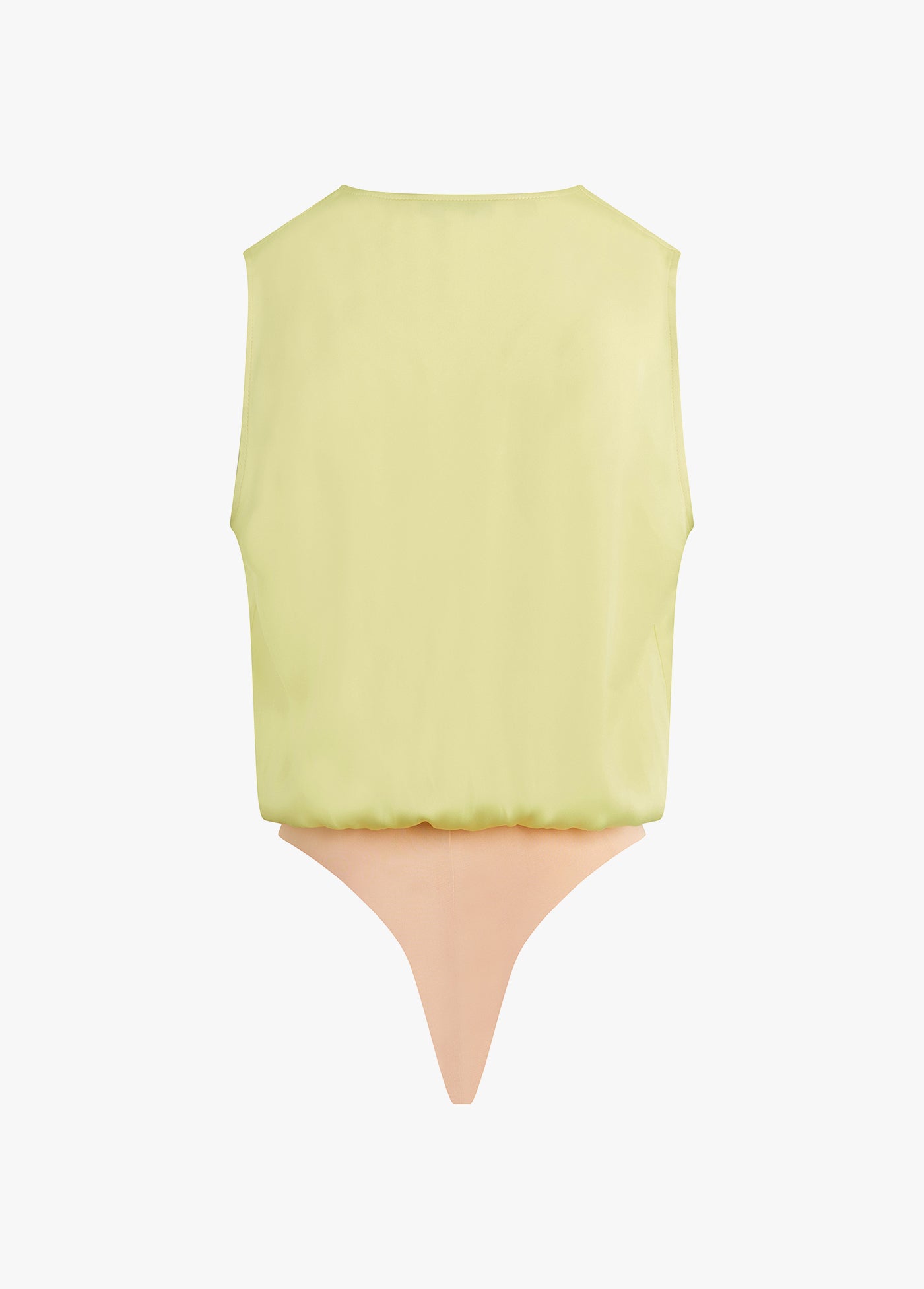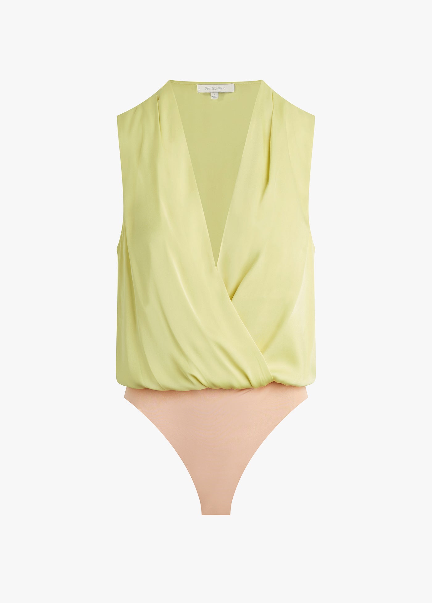 Text me when you get home. Our best-selling, sleeveless satin bodysuit--with a pleated neckline and a soft drape. Cut from a silky-soft polyester satin fabric made in Korea. The comfortable snap bodysuit makes it a no-fuss tuck, so it’s effortlessly easy to wear on its own and a favorite look in Limeade when styled with denim.