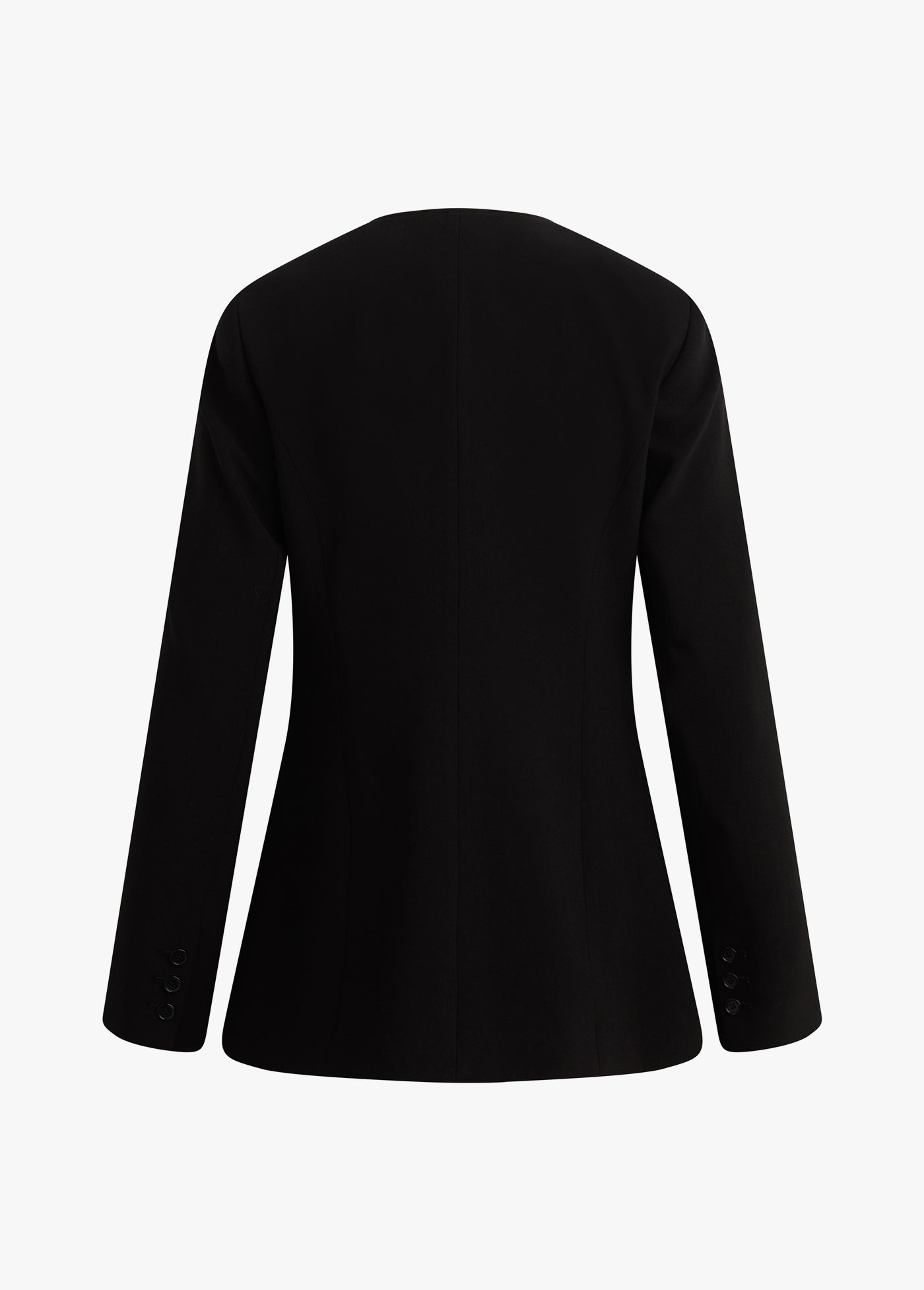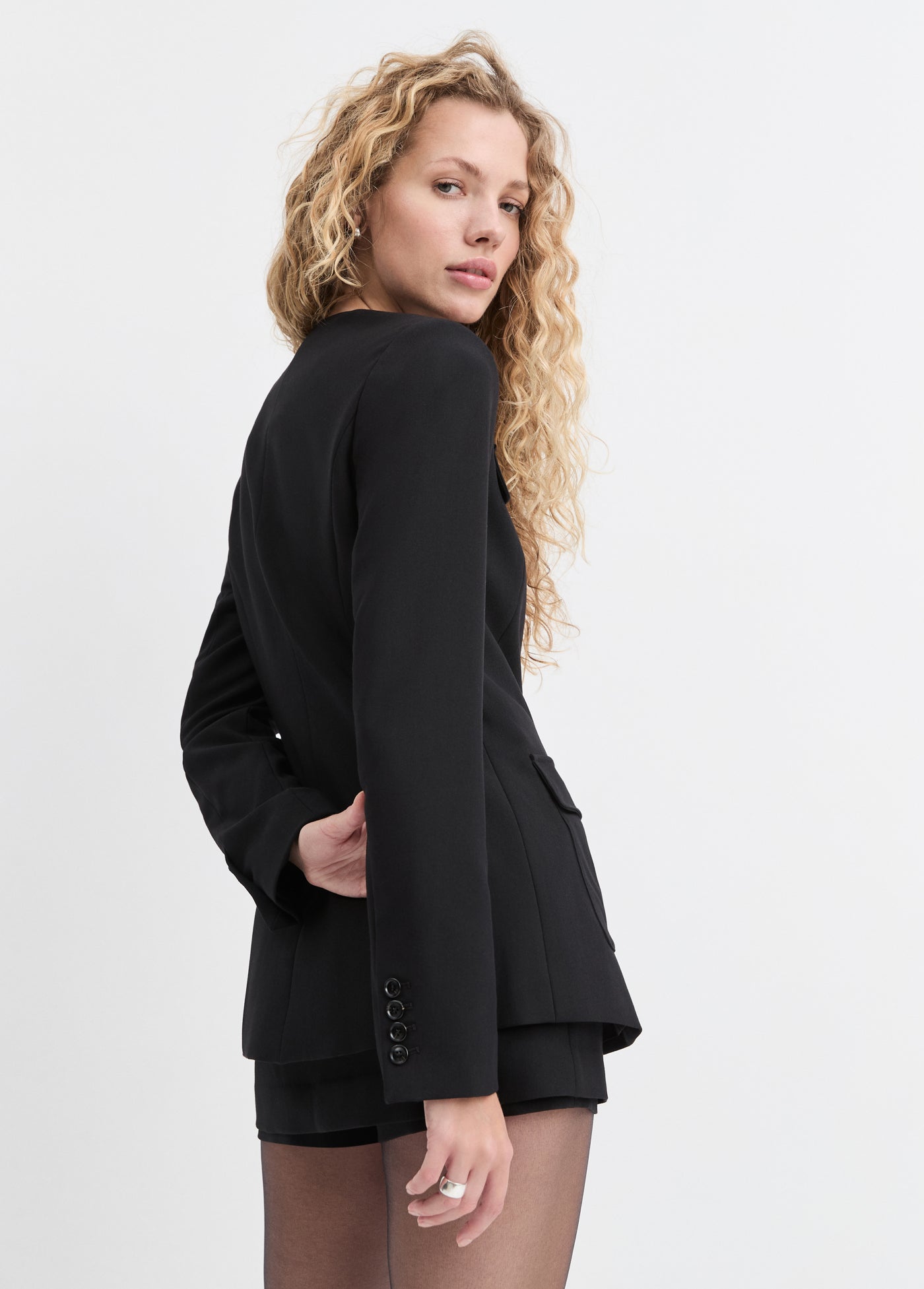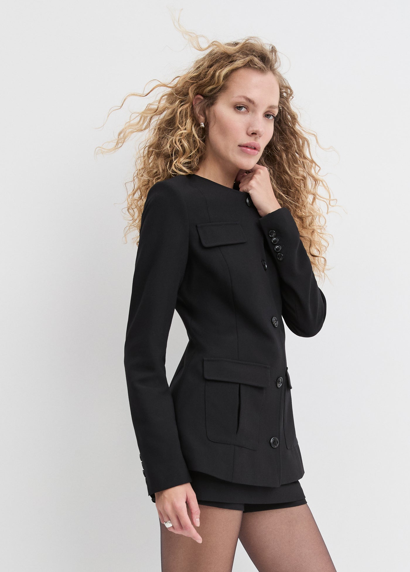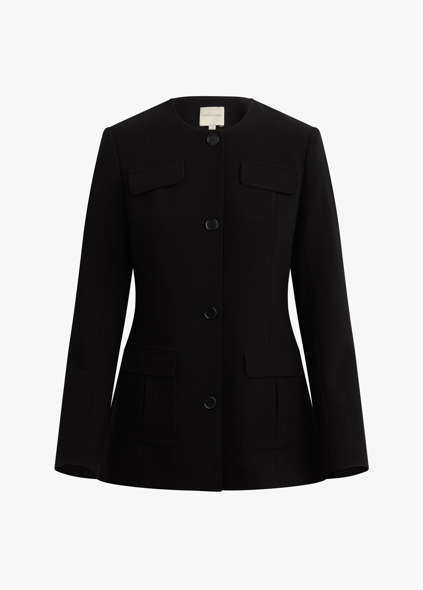The Spencer Jacket is a favorite for work and after-hours. Crafted from a soft wool blend in black, this collarless jacket features front patch pockets and a military-inspired edge. Fully lined and longer in length, it pairs perfectly with The Spencer Skort or stands out on its own.