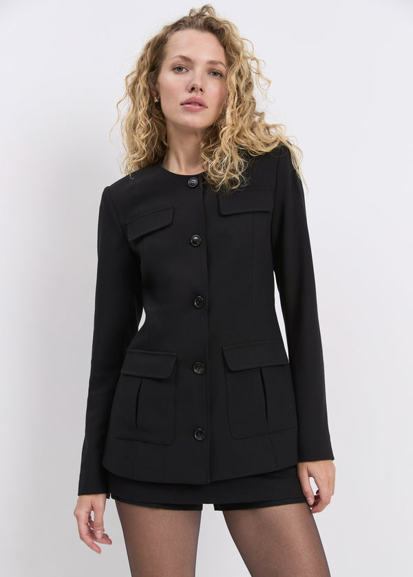 The Spencer Jacket is a favorite for work and after-hours. Crafted from a soft wool blend in black, this collarless jacket features front patch pockets and a military-inspired edge. Fully lined and longer in length, it pairs perfectly with The Spencer Skort or stands out on its own.