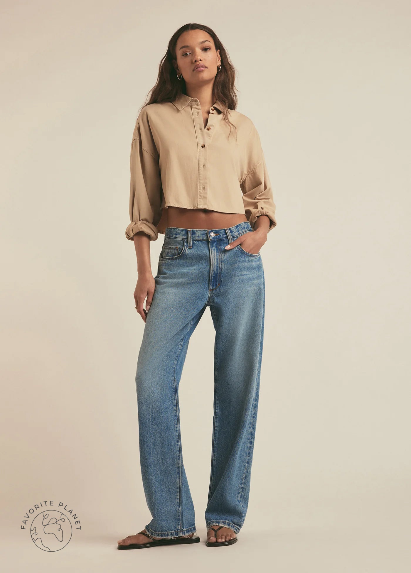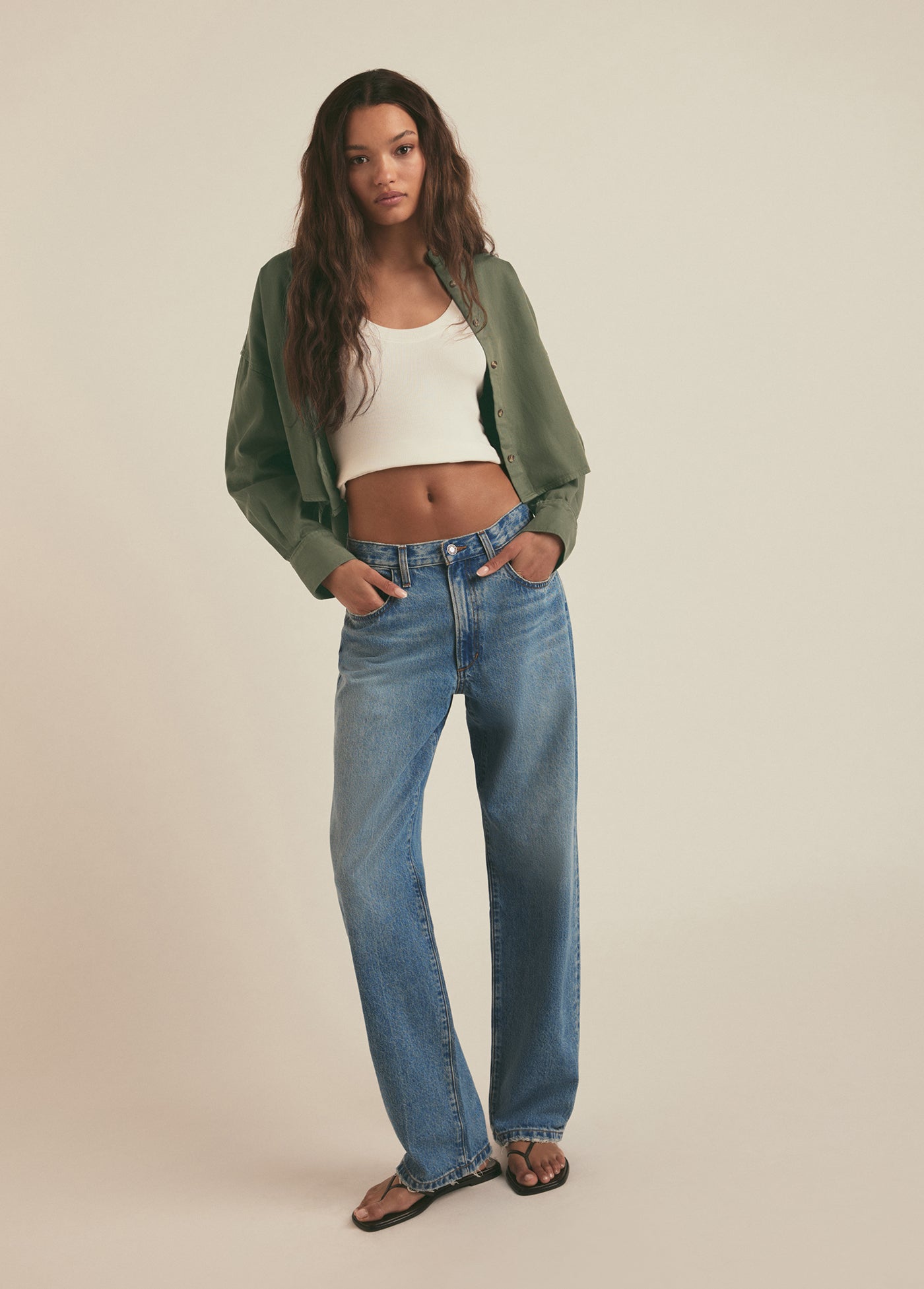 Borrowed from the boys. The Tommy is the ultimate relaxed boyfriend jean–easy at the waist and low slung at the hips for a long and loose style. Cut from our Favorite Planet eco-denim that doesn't use stones or chemicals, the medium-light blue wash of Margate has contrast whiskering and five-pocket details. The rigid denim has a soft feel and fits true to size and will give with each wear.
