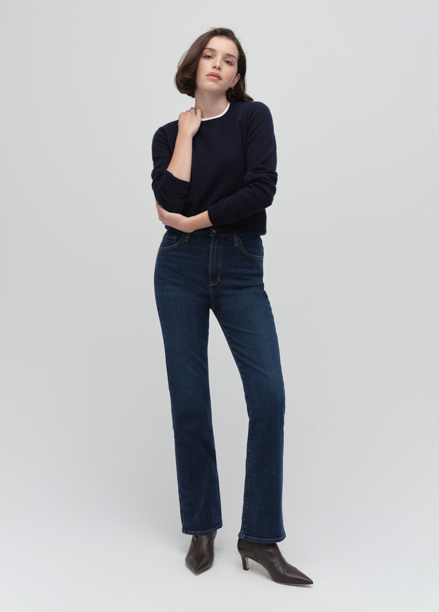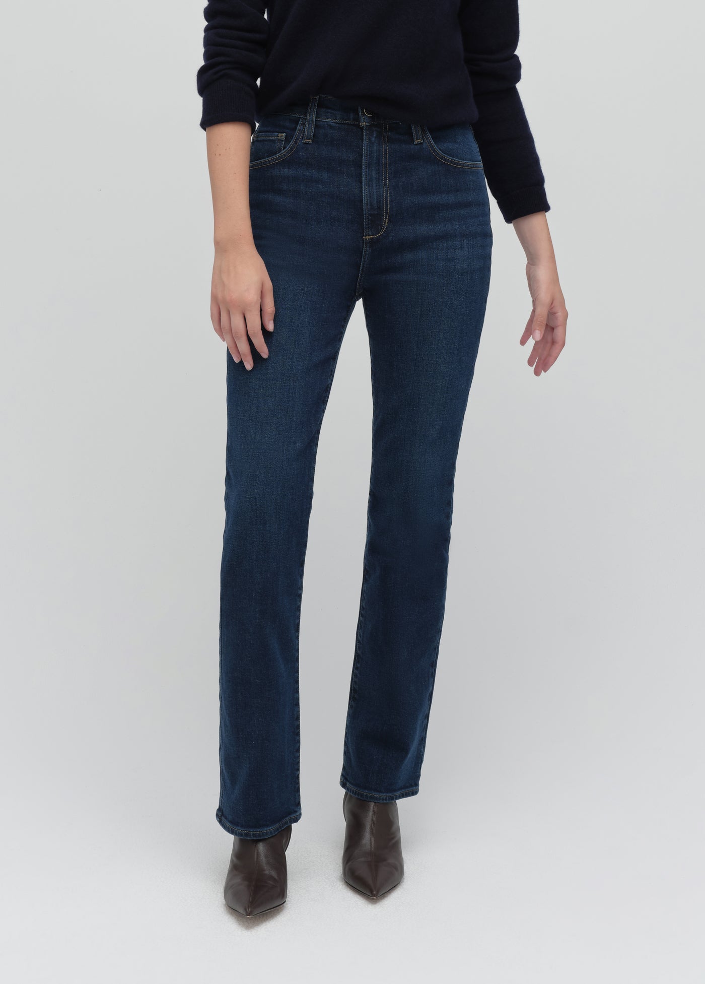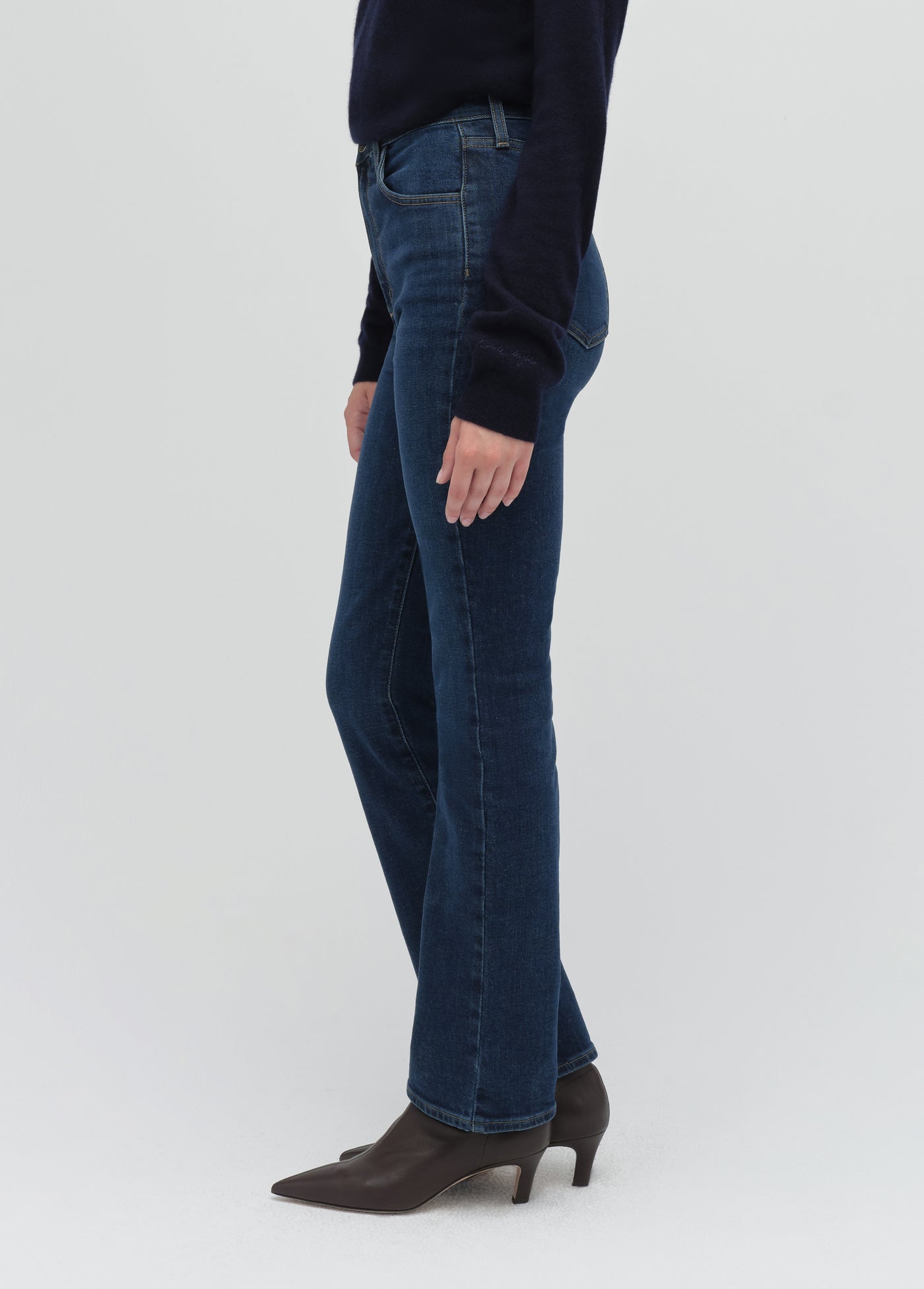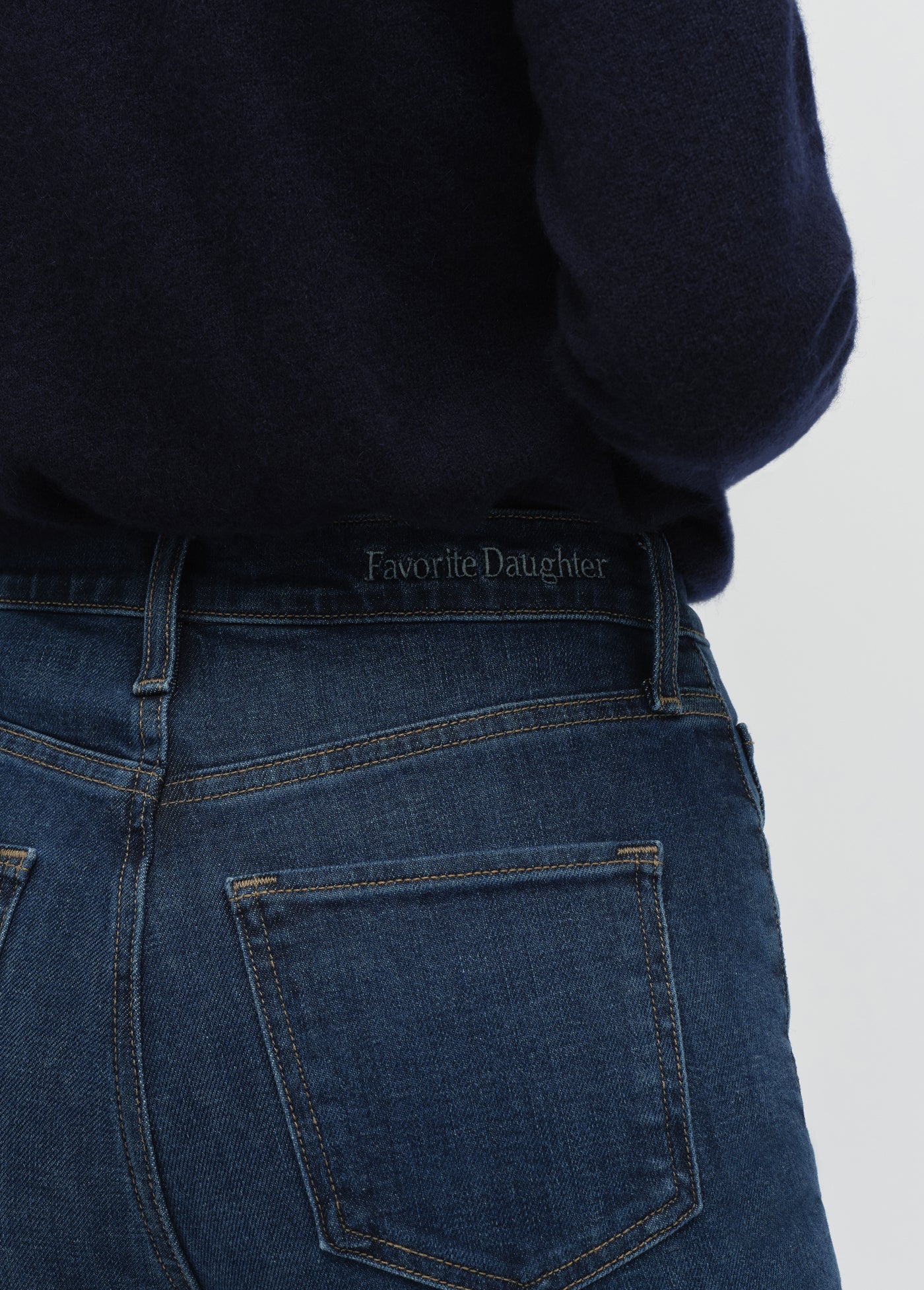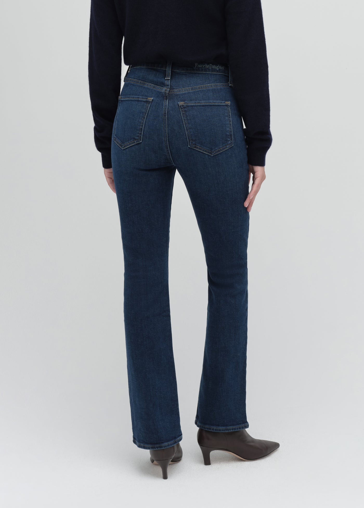 Perfectly proportioned to fit and hit the right places on a petite frame. The retro-inspired style of Woodside gives the Valentina a slimming, rich, dark blue indigo and the stretch gives this denim a well-fitted silhouette. (Gentle fading and whiskering plus Favorite Daughter embroidery on the back waistband, of course.)