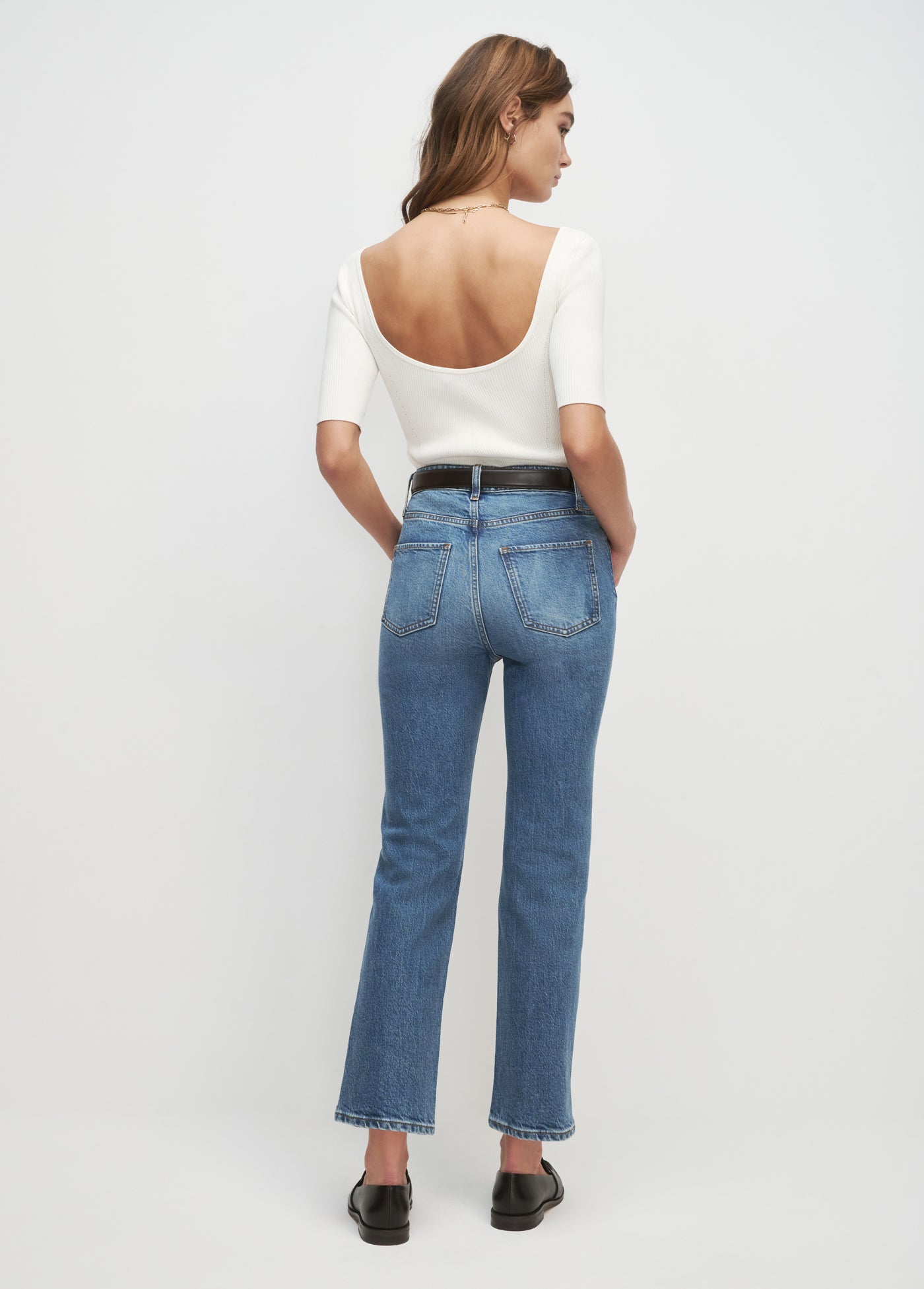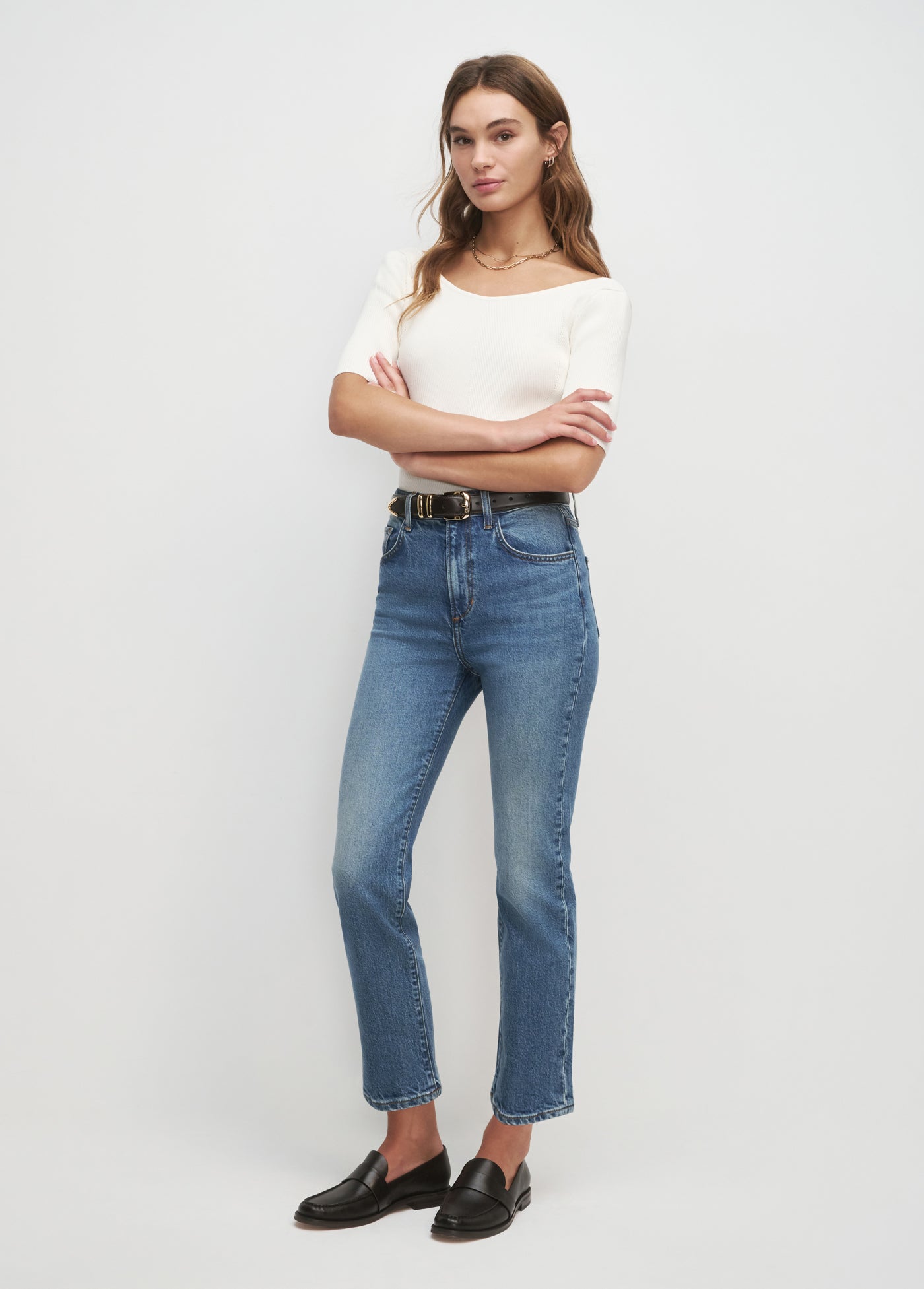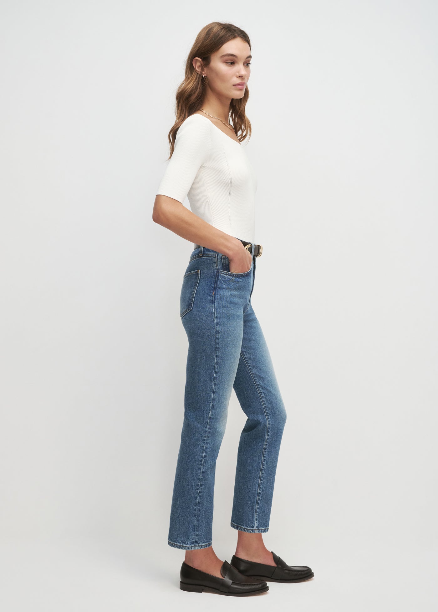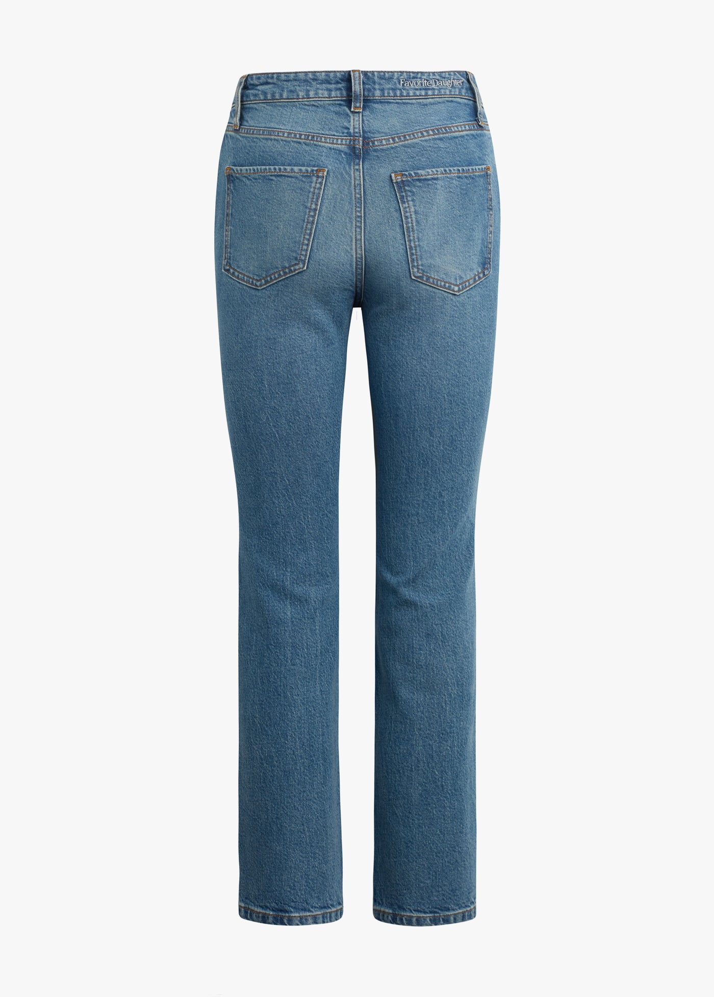 This Valentina silhouette in Alton is a true straight leg ankle made from comfort stretch denim in a medium-blue wash with whiskers and fading. Meant for everyday wear, this style is fitted at the hips with a 12" rise and straight down from thigh to opening with a 28" inseam. (Favorite Daughter embroidery on the back waistband, of course.)