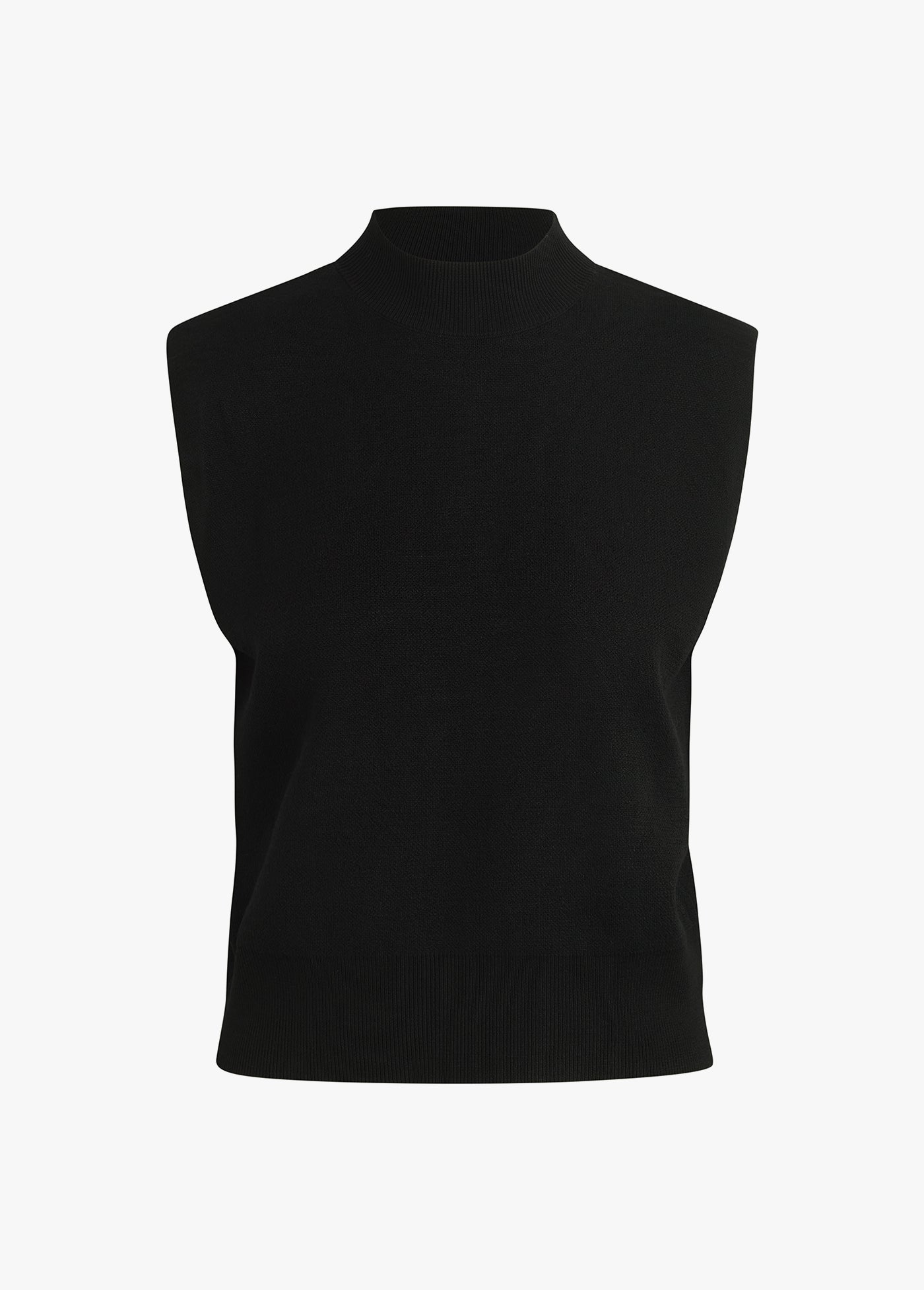 Wear The Whitney Top when you are looking for effortless, seasonless styling. With a mock neck and shoulder pads, this sleeveless top has a tailored fit that hits perfectly at the waist. Plus, it's made from a plain stitch knit so it's soft and easy to wear.