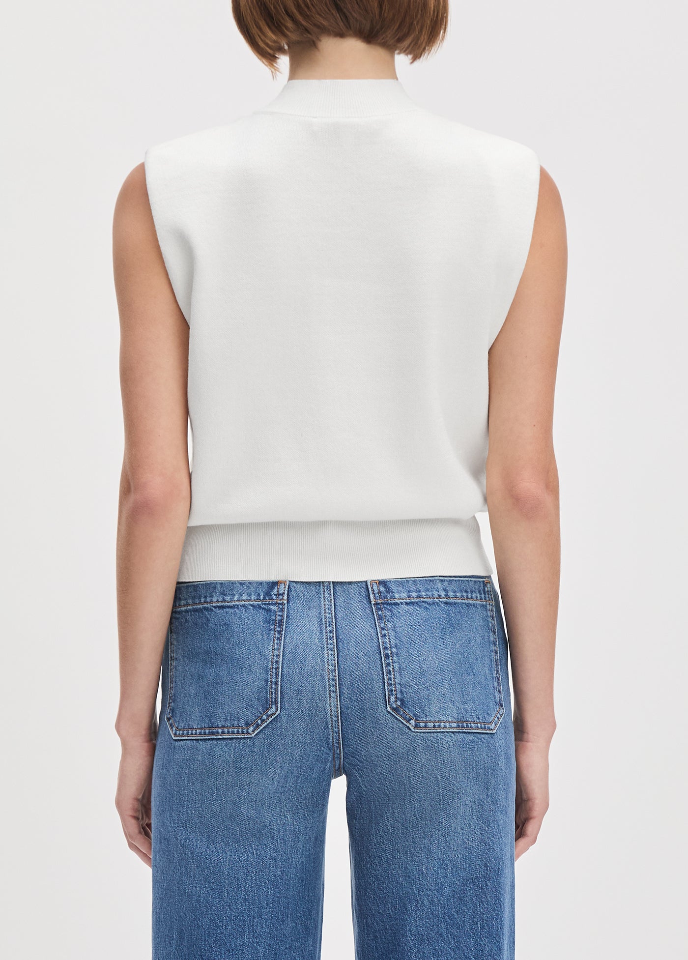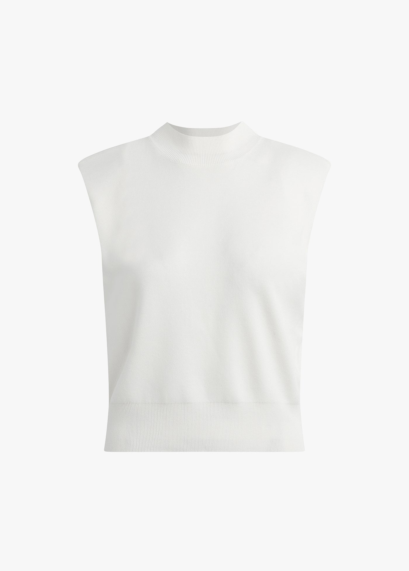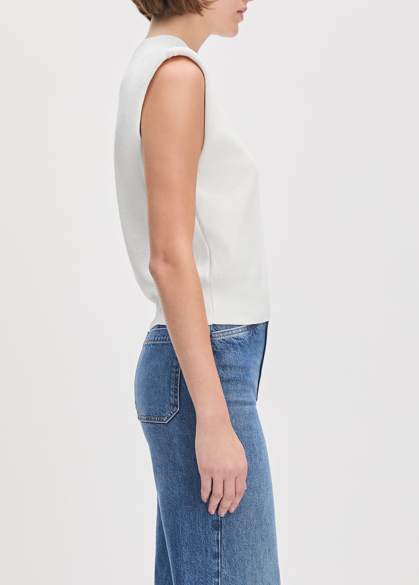 Wear The Whitney Top when you are looking for effortless styling. With a mockneck and shoulder pads, this sleeveless top has a tailored fit that hits perfectly at the waist. Plus, it's made from a plain stitch knit so it's soft and easy to wear.