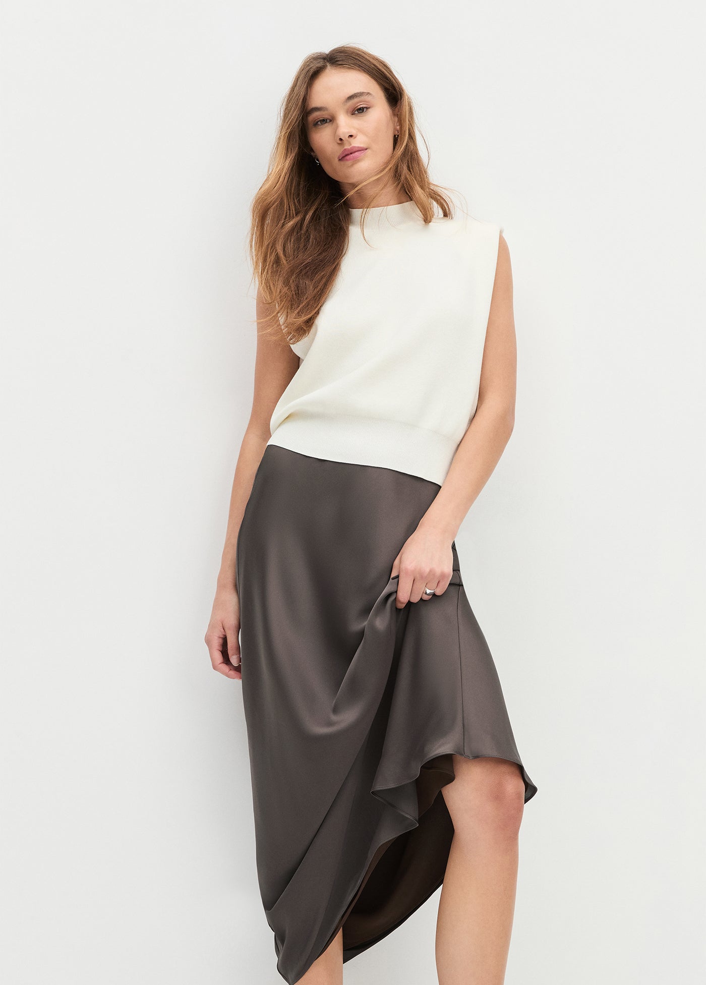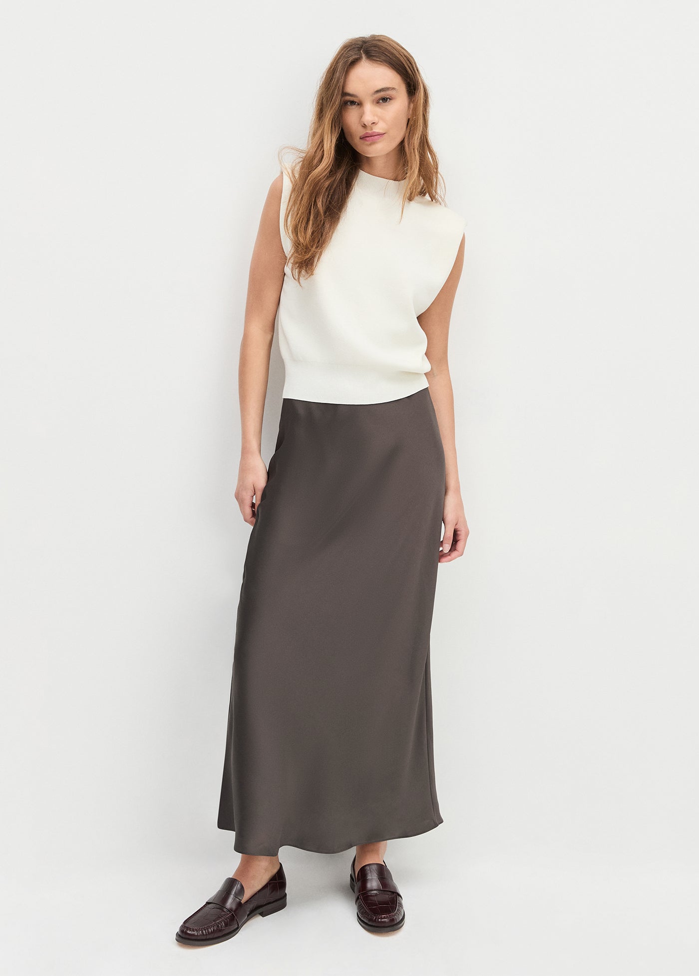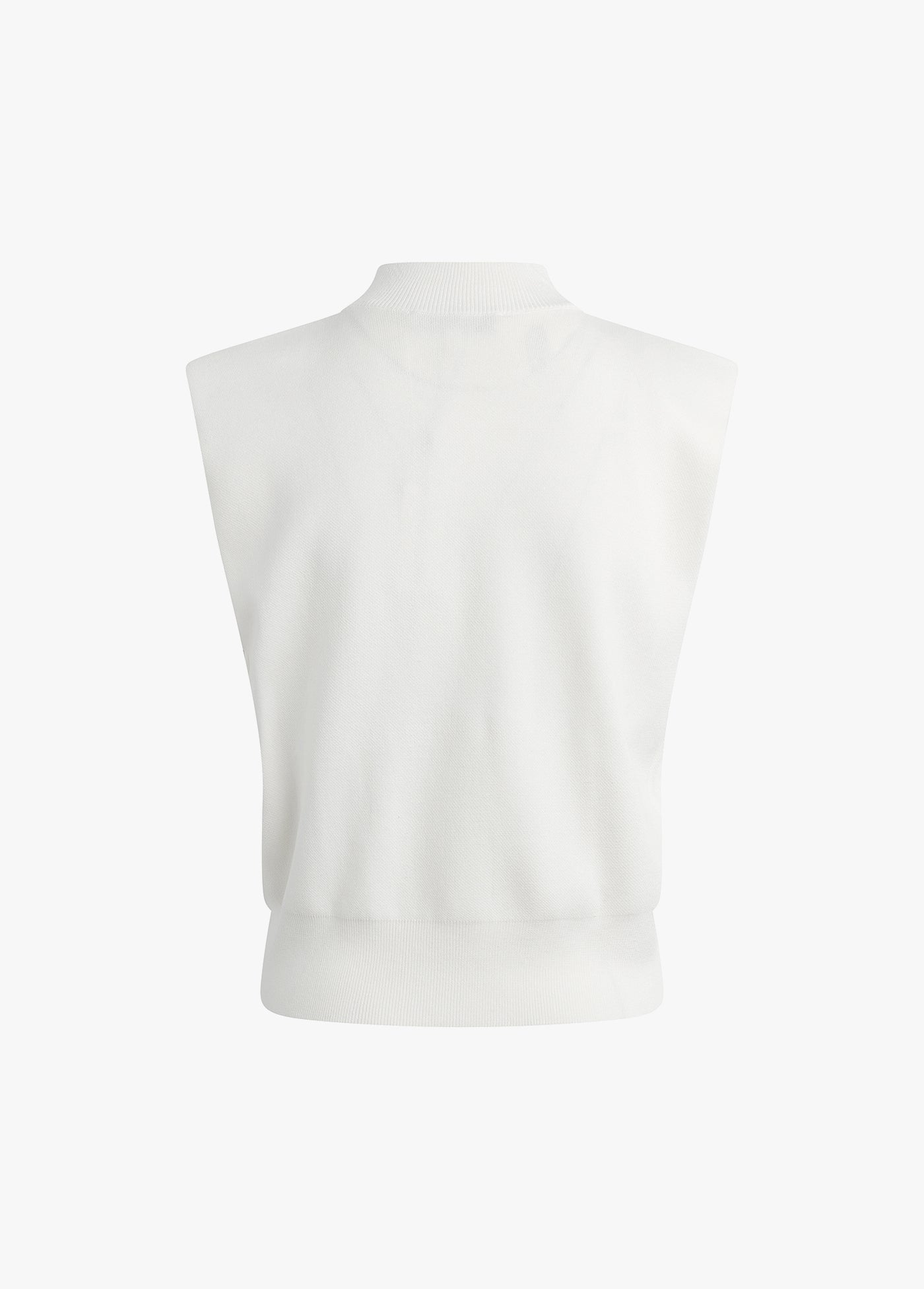 Wear The Whitney Top when you are looking for effortless styling. With a mockneck and shoulder pads, this sleeveless top has a tailored fit that hits perfectly at the waist. Plus, it's made from a plain stitch knit so it's soft and easy to wear.