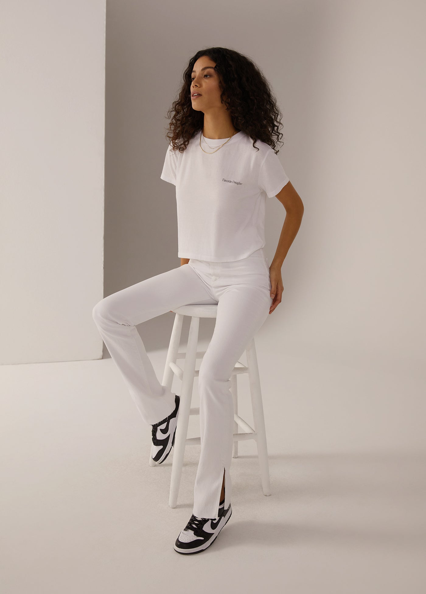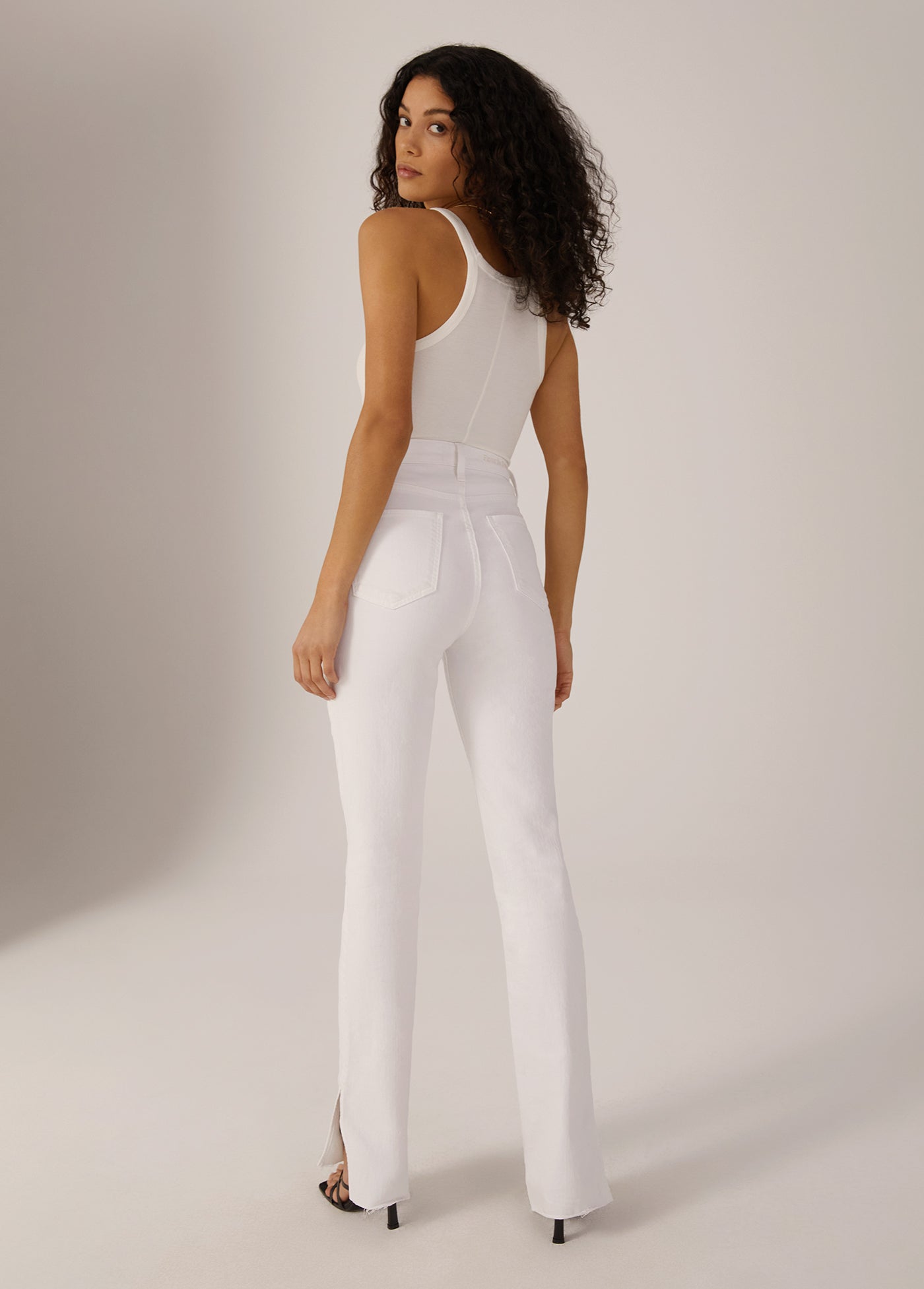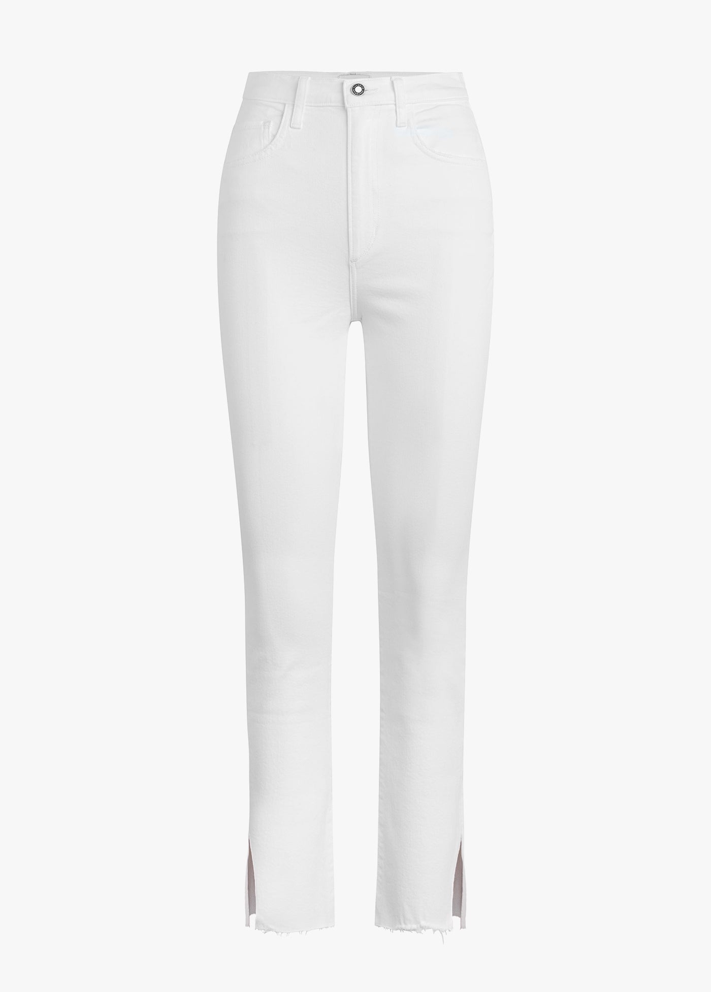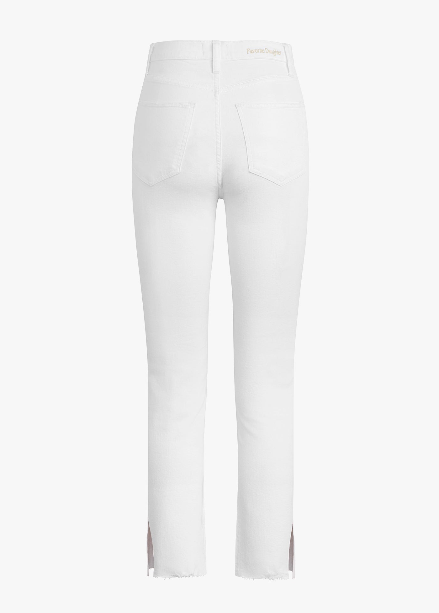 A high five for the super high rise 11.5" jeans. This bright white Valentina is so soft to the touch and the stretch gives this denim a well-fitted silhouette. With a 34" inseam, this longer leg, show-stopping silhouette has an unexpected side slit along the cut hems. (Favorite Daughter embroidery on the back waistband, of course.)