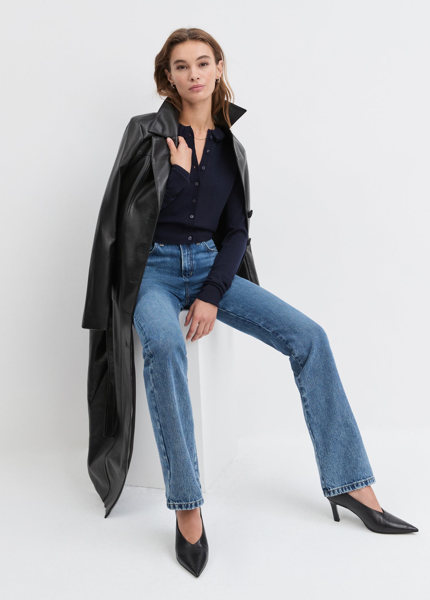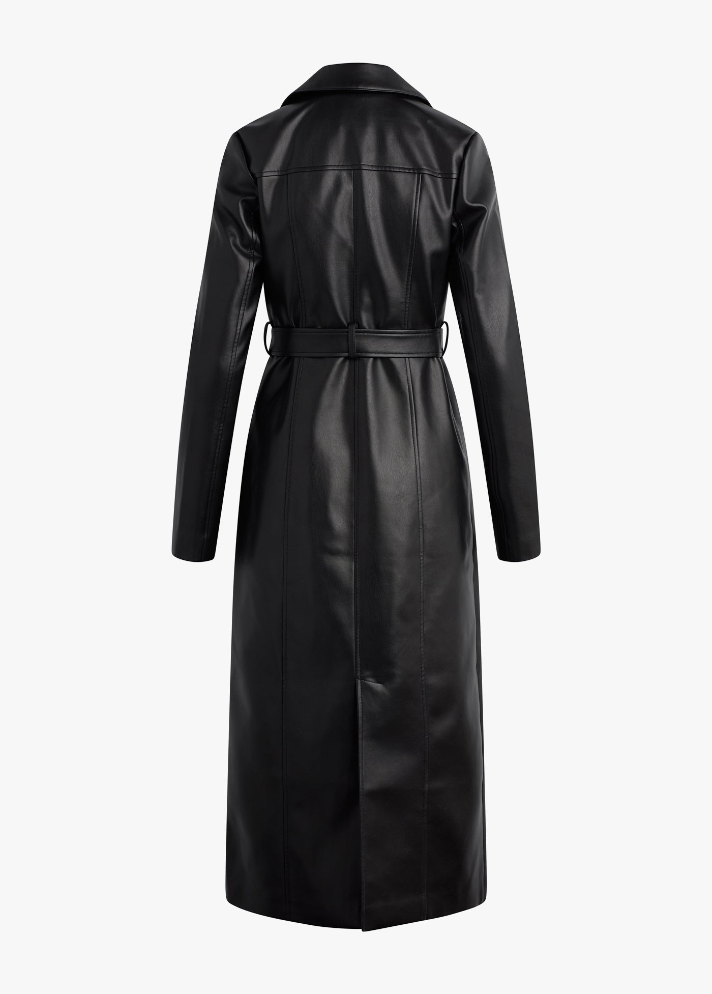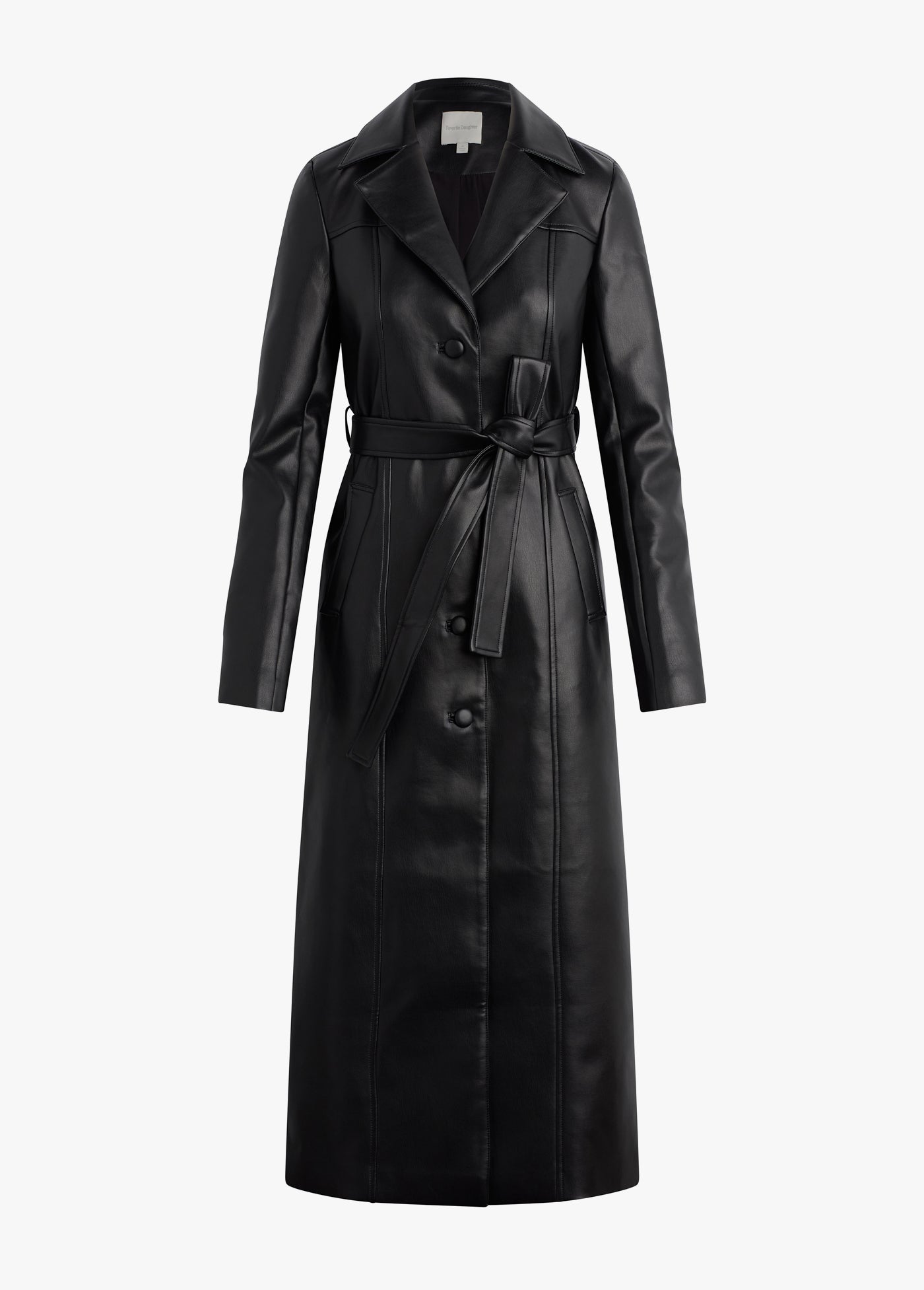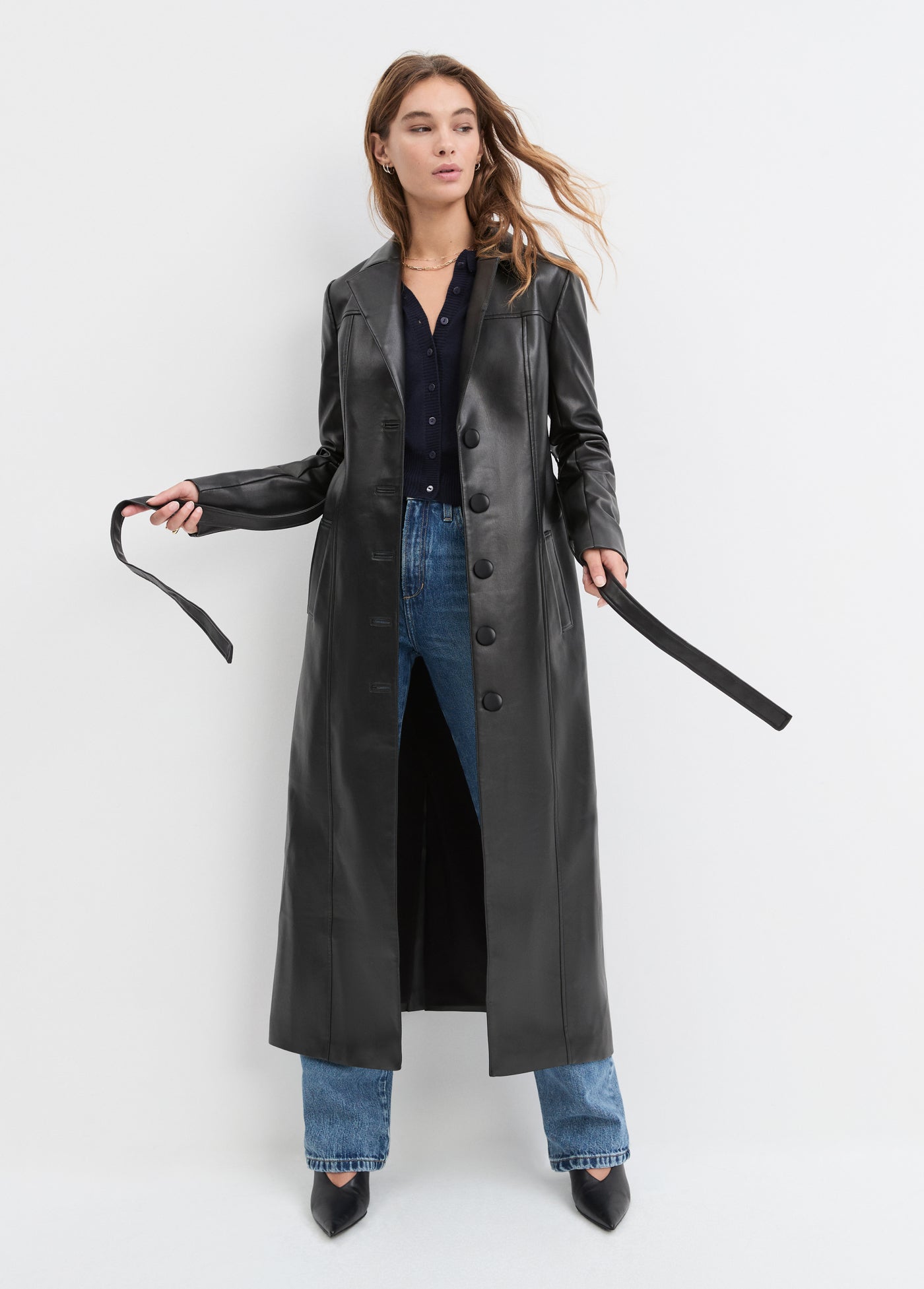We took a classic coat silhouette and made it extra cool. The Vegan Leather Belted Coat is long (52") with a slim fit and center-front buttons. Cinch it with the self-tie belt or wear it open. Either way, it’s a favorite.